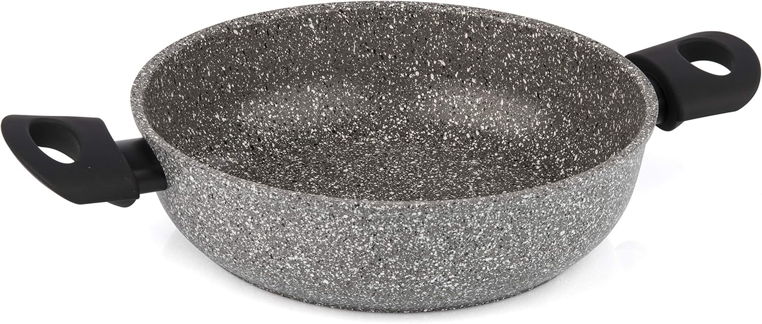 - Corpo in alluminio ad altissimo spessore, che diffonde il calore in modo più uniforme, assicura un basso consumo energetico e permette un migliore ancoraggio del rivestimento antiaderente, rendendo la padella molto più duratura, made in italy