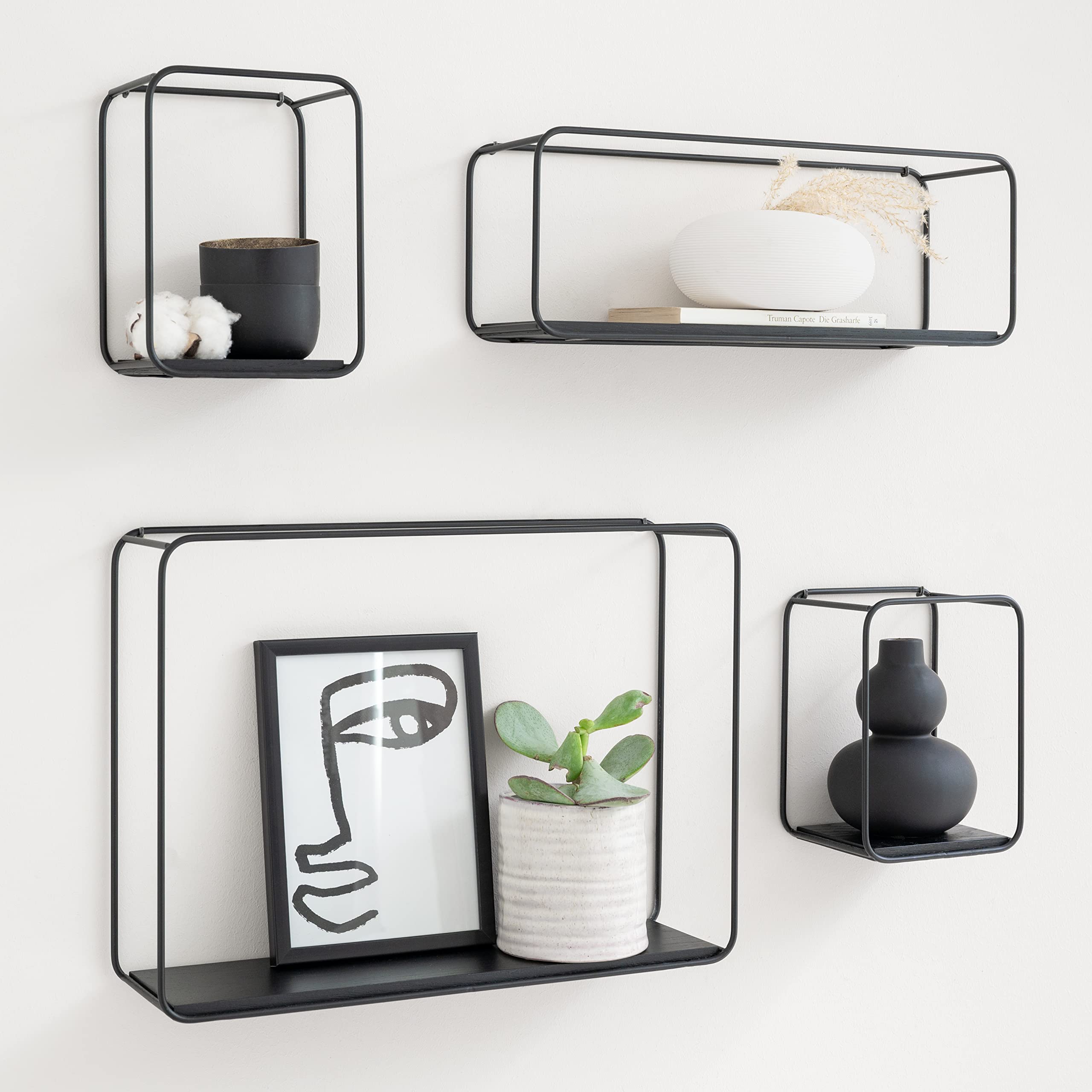 - Questo set di mensole cubiche a quattro elementi combina elegantemente superfici in impiallacciatura di vero legno con una raffinata struttura in metallo nero opaco.