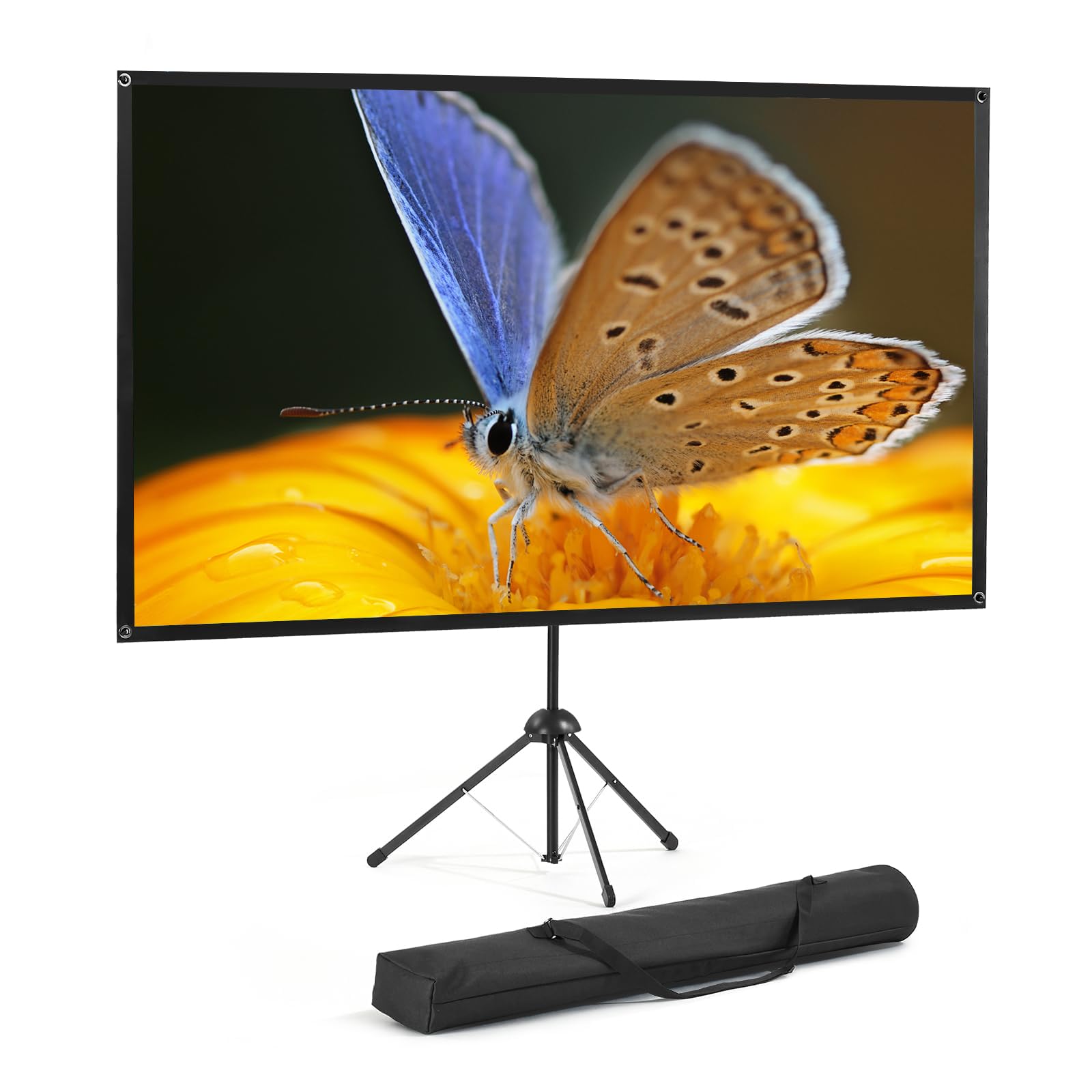 - [Contenuto della confezione]: 1 schermo di proiezione da 100 pollici, un treppiede e un telaio a forma di X, 1 borsa nera. Siamo sempre dietro i nostri clienti e facciamo del nostro meglio per soddisfare le vostre esigenze. Se mancano parti nel pacchetto o non siete soddisfatti, non esitate a contattarci.
