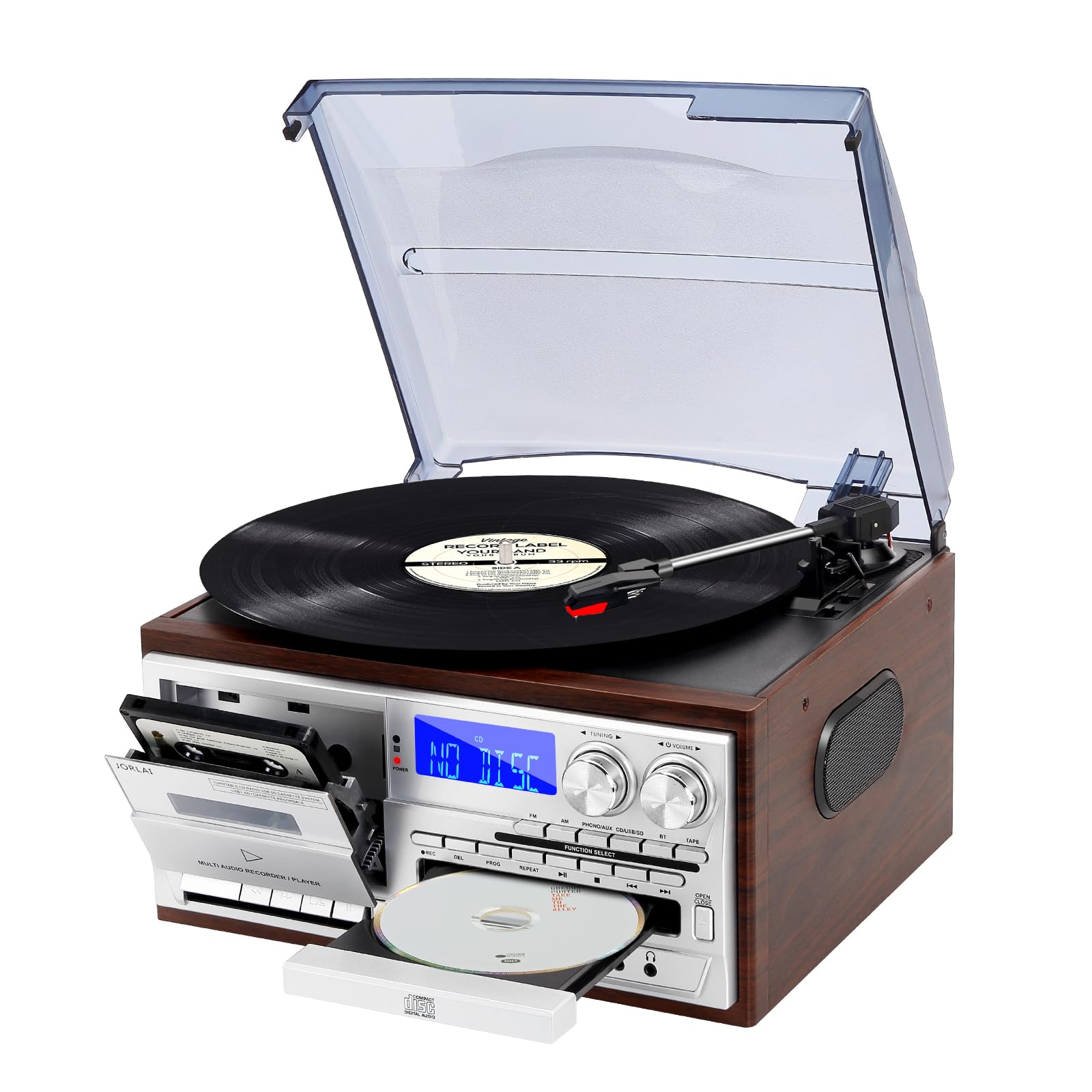 - Il giradischi Jorlai 9 in 1 è un sistema audio vintage compatto e versatile (dimensioni 15.00x13.62x10.23 pollici) che integra lettore CD e cassette, connettività Bluetooth per la riproduzione wireless, radio digitale AM/FM, funzionalità di riproduzione e codifica USB/SD, ingresso Aux-In da 3,5 mm e uscite per cuffie e linea RCA per altoparlanti esterni.