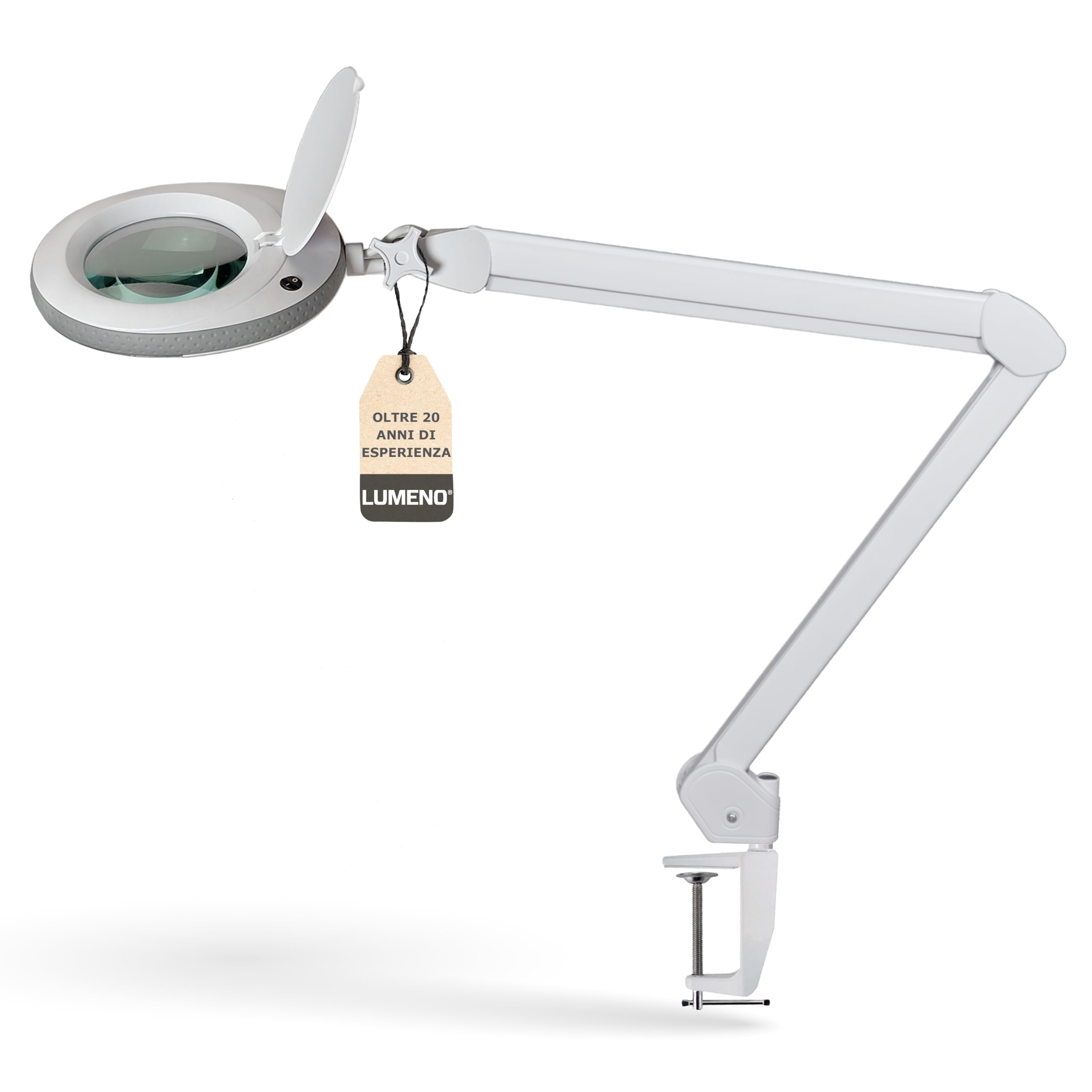 - La confezione include la lampada con lente d'ingrandimento Lumeno 721X, un morsetto da tavolo adatto per piani fino a 65 mm, l'alimentatore di rete e le istruzioni.