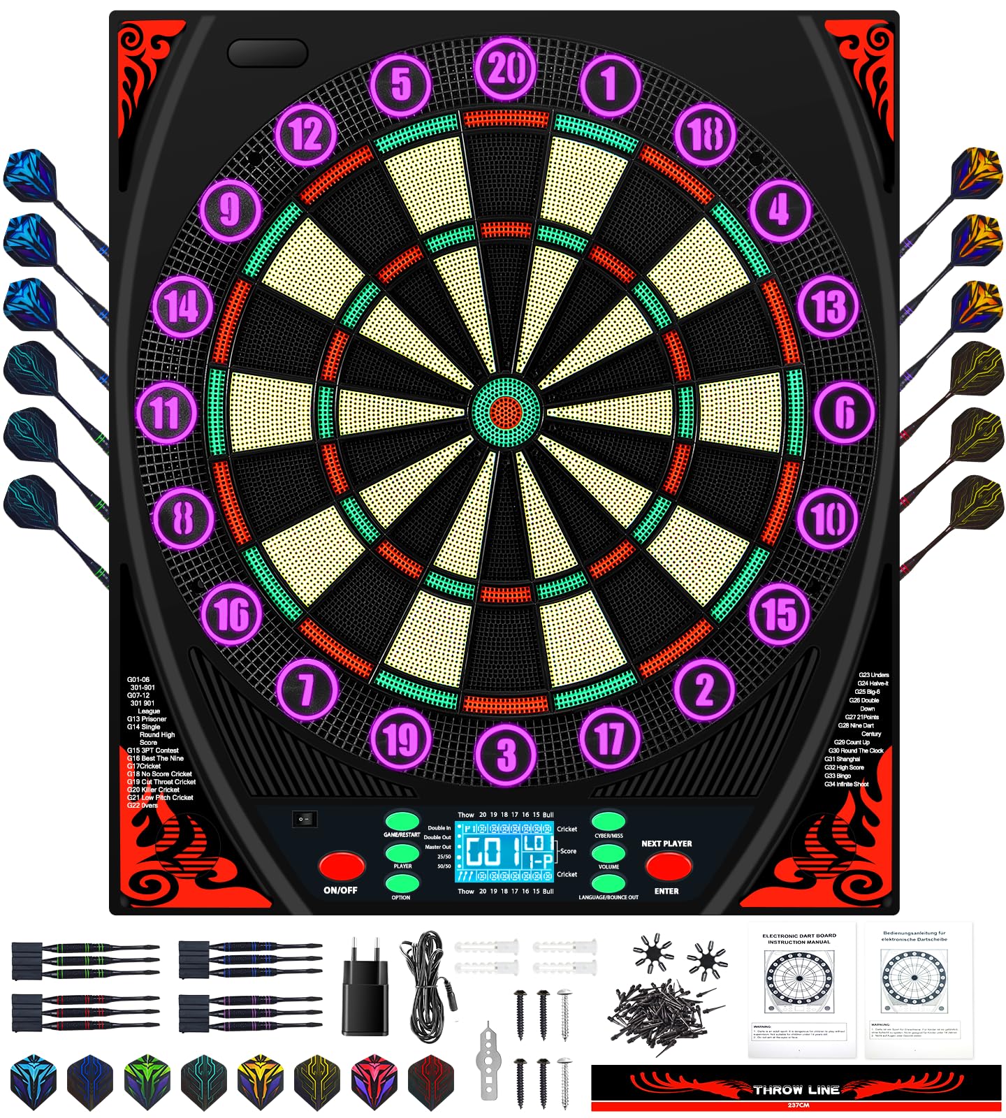 - Anello numerico illuminato in 8 colori e schermo LCD: il bersaglio elettronico ha un interruttore per il controllo della luce. È possibile accendere e spegnere le luci nell'anello numerico secondo necessità. È bianco prima che inizi il gioco. Una volta che il gioco inizia, ogni giocatore rappresenta un colore. Accendere l'interruttore della luce e il display può essere attenuato, il che è normale. Entro 2 metri è possibile visualizzare elettronicamente il contenuto del display illuminato del bersaglio