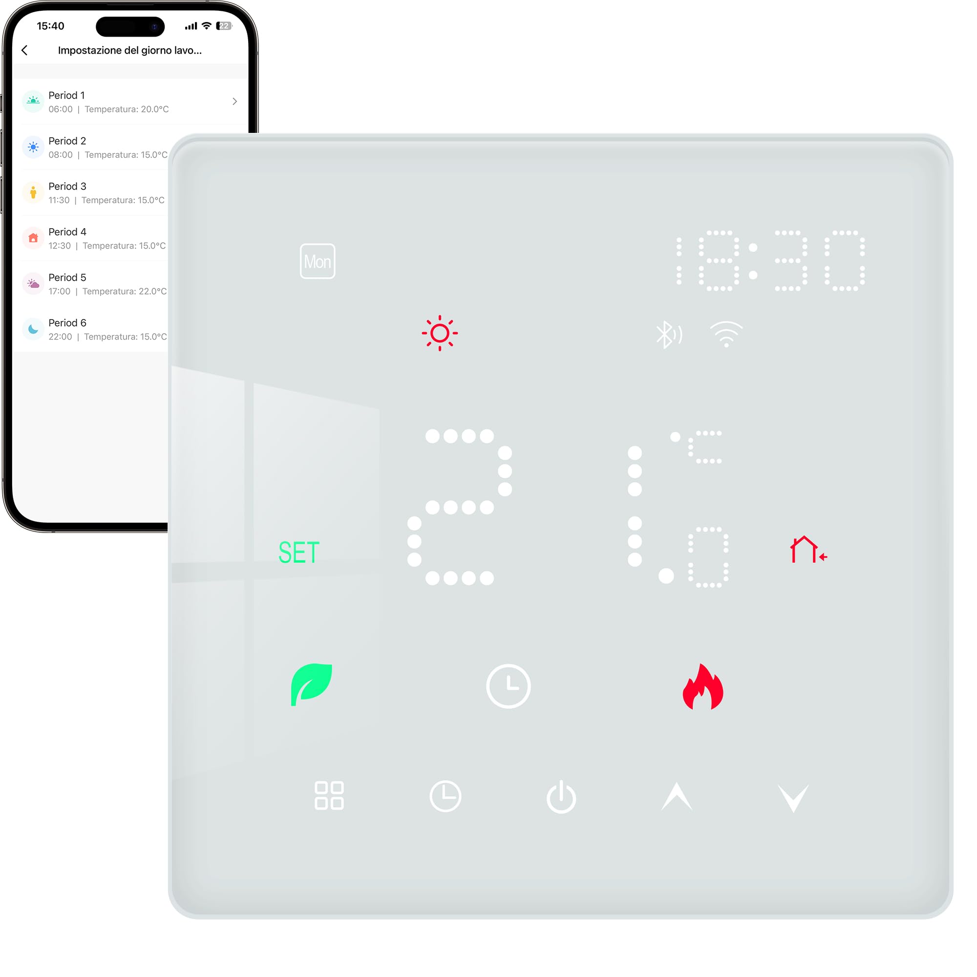 - [Piano di riscaldamento settimanale] 3 modalità programmabili: 5+2, 6+1 e 7 giorni a settimana. Nell'app puoi creare orari intelligenti che specificano il tempo e la temperatura di riscaldamento per ridurre il consumo energetico.