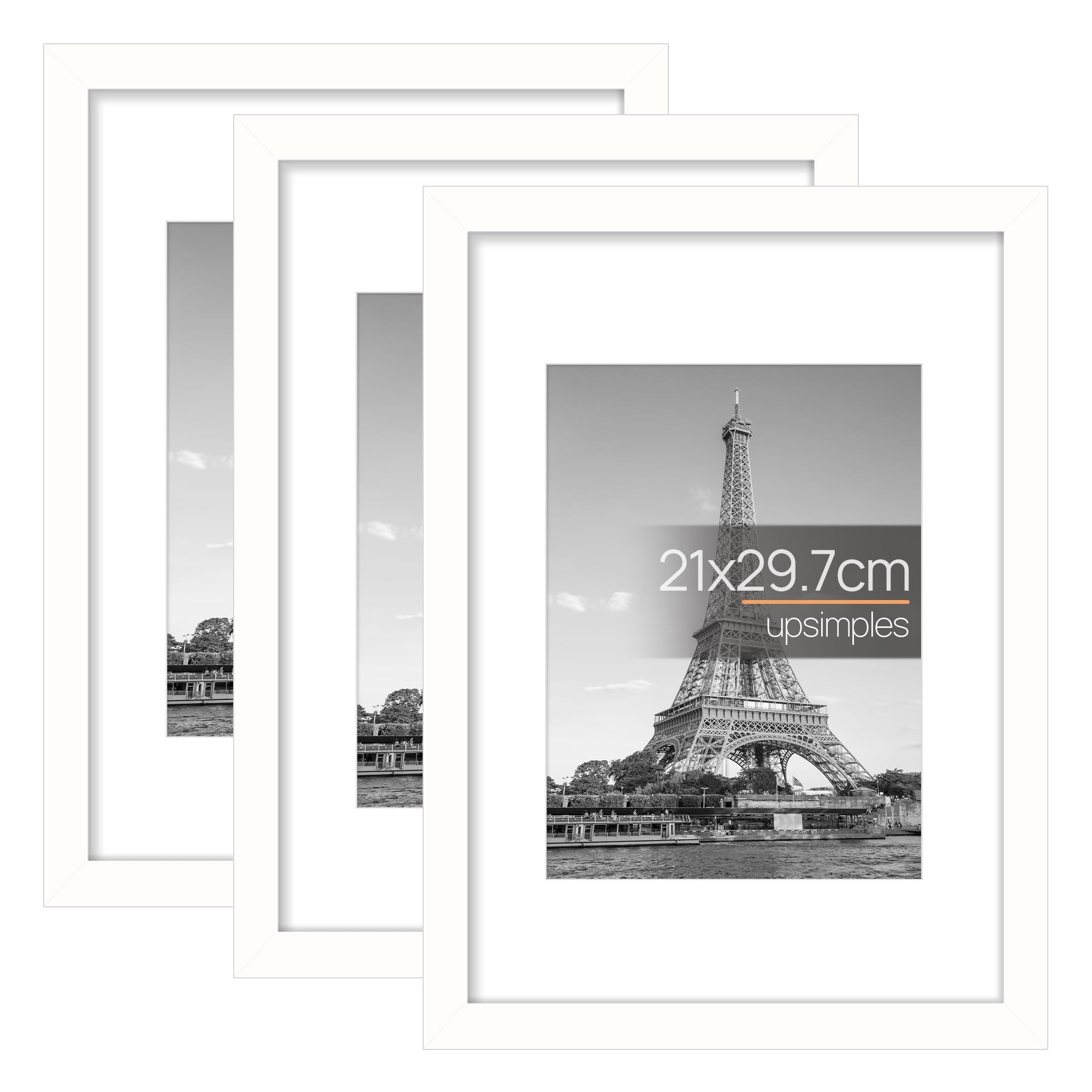 - Questa confezione include tre cornici portafoto di colore bianco, progettate per ospitare immagini in formato A4 (21x29,7 cm).