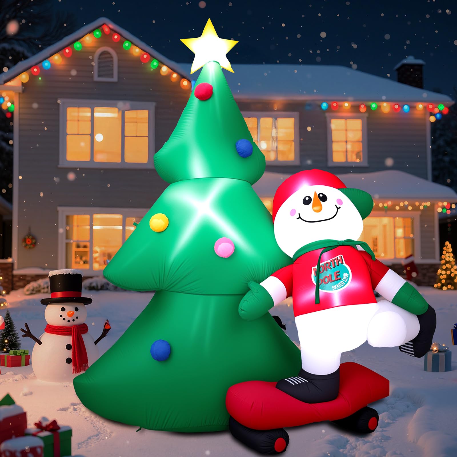 - Decorazione Natalizia Vivace e Divertente: Questo pupazzo di neve con albero di Natale e snowboard, alto 213CM/7FT, porta gioia e allegria. Arriva scivolando per consegnare regali e auguri natalizi ai bambini, creando un’atmosfera rilassata e festosa.