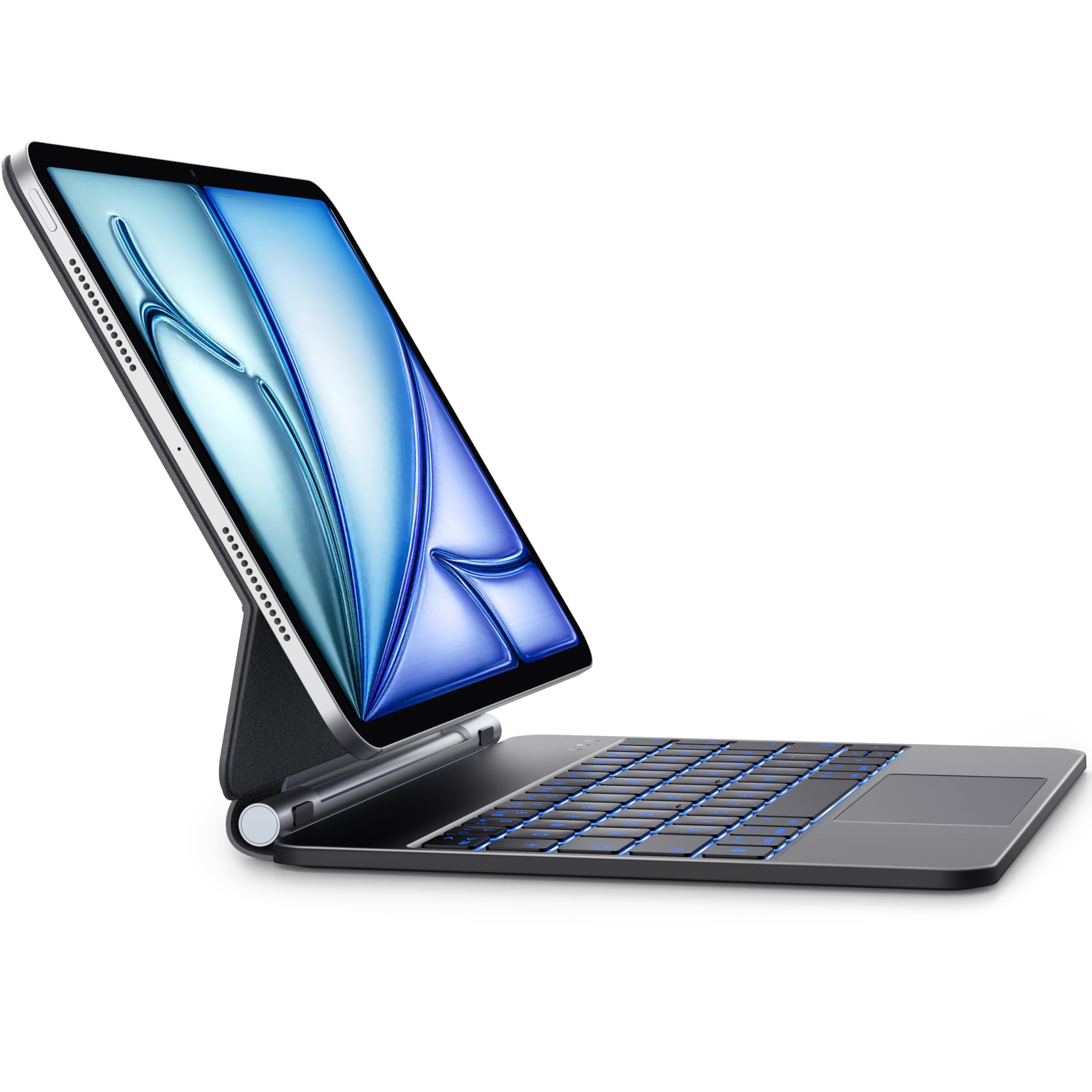 - Il design a supporto cantilever flottante permette di posizionare l'iPad magneticamente, offrendo un'esperienza simile a quella di un laptop e consentendo di regolare l'angolo di visione fino a 135 gradi.