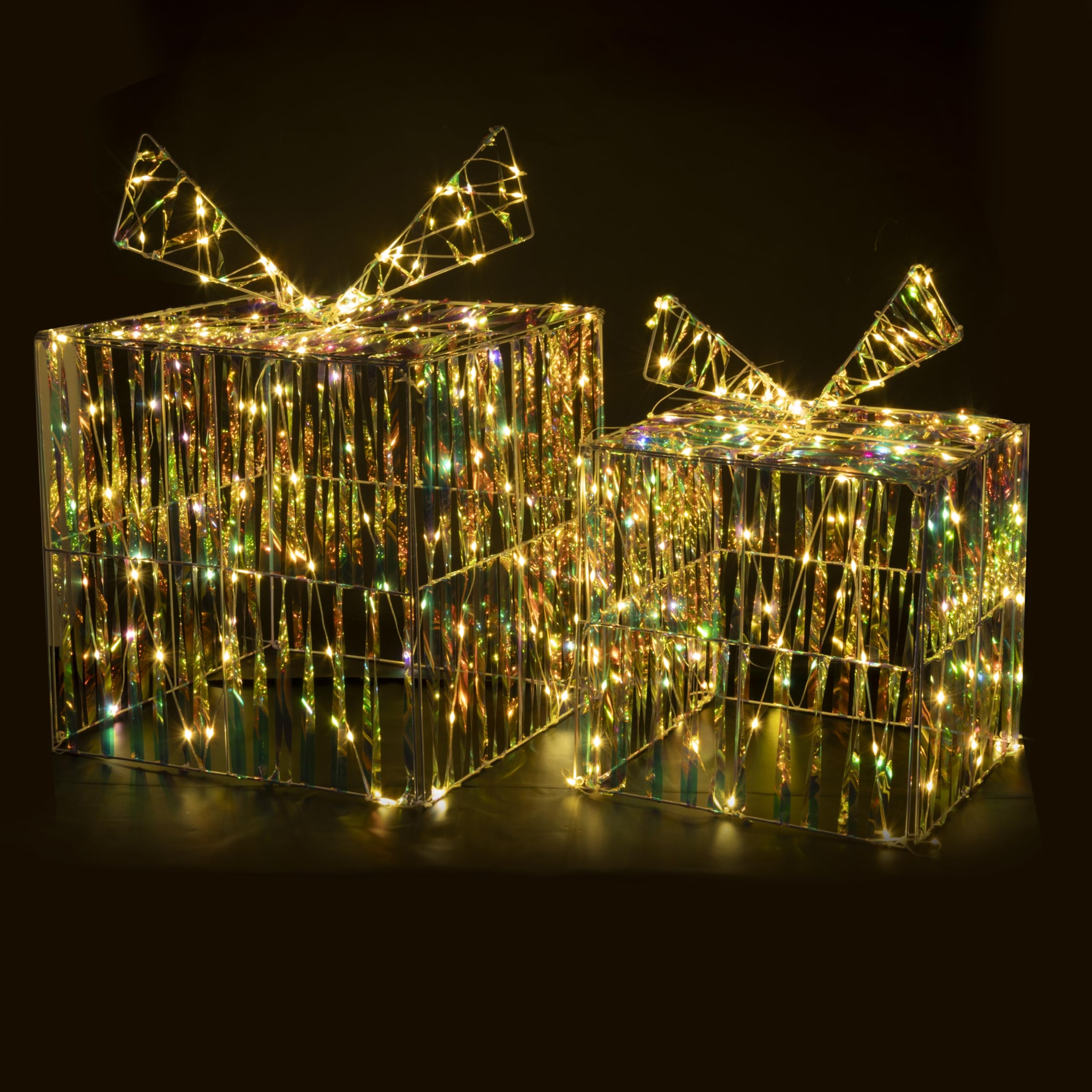 - Set scatole regalo Santa's House Uso esterno In PVC Struttura in ferro 120 microled in resina epossidica Distanza led: 10 cm Timer: 6 ore ON/24 ore OFF Lunghezza cavo: 5 metri Input: 230 V 50 Hz Output: 24V DC Potenza: 6 W Il set si compone di due scatole led: Scatola piccola: l. 40 x p. 40 x h. 40 cm (altezza con fiocco 60,5 cm) Scatola grande: l. 50 x p. 50 x h. 51 cm (altezza con fiocco h. 75 cm)