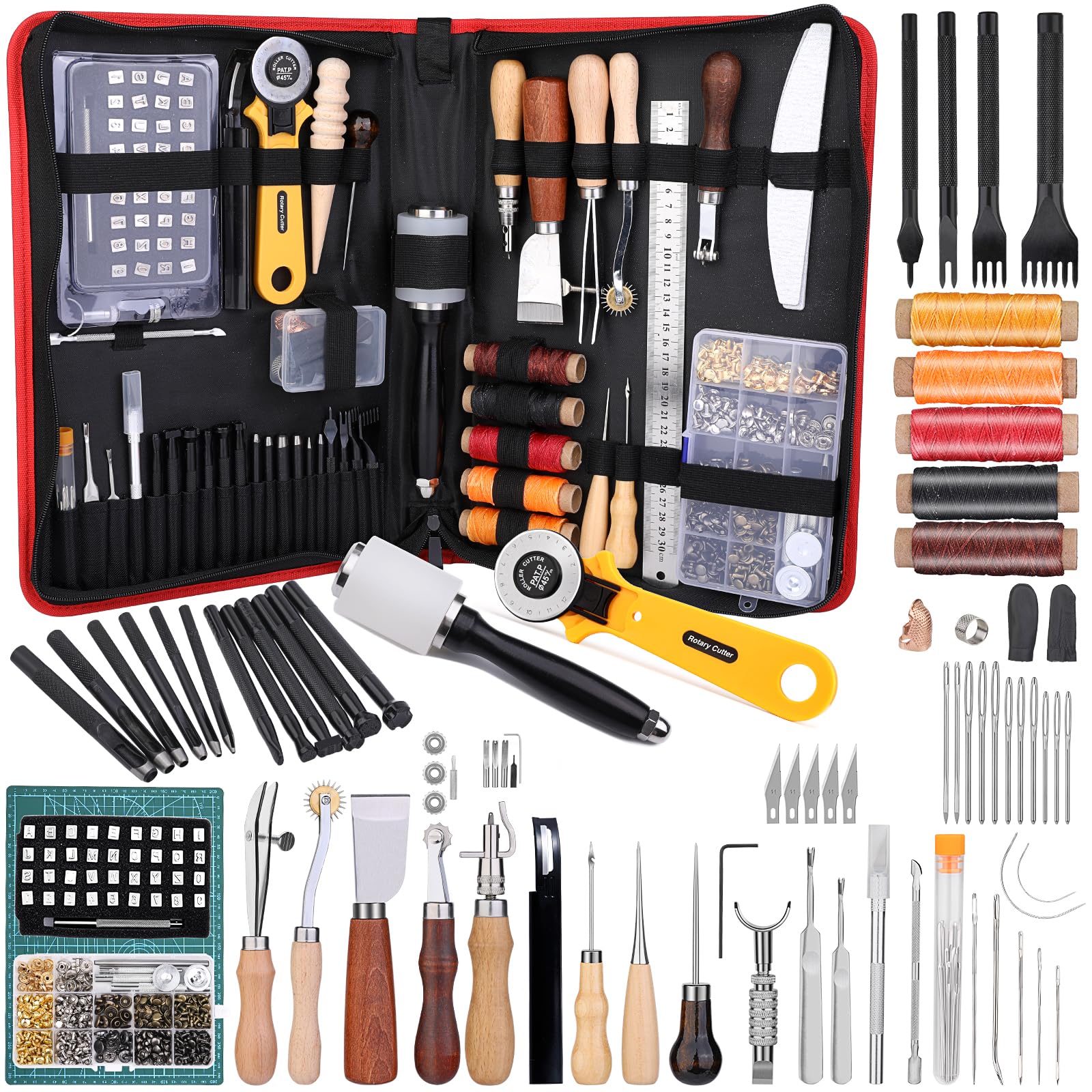 - Kit in pelle: il nostro kit di attrezzi per la pelle include una varietà di strumenti per la lavorazione della pelle, come segue: strumenti per la timbratura della pelle, strumenti per punzonatura a artigli, smussatura dei bordi della pelle, scanalatura dei bordi, rivetti in pelle, martello per intagliare la pelle, tappetino da taglio, punzonatura da cucire, filo cerato. , ditale, scanalatrice da cucito, skiver e una borsa di stoccaggio.