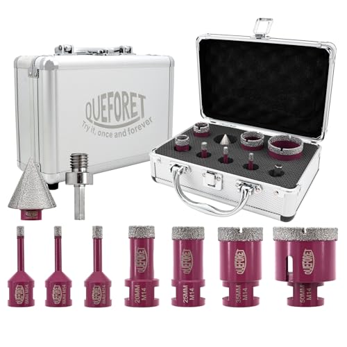 - Il set include 9 pezzi: 7 punte diamantate nei diametri 6, 6, 8, 20, 25, 35, 50mm, una punta per smussare da 2-35mm e un adattatore da filettatura M14 a gambo esagonale.