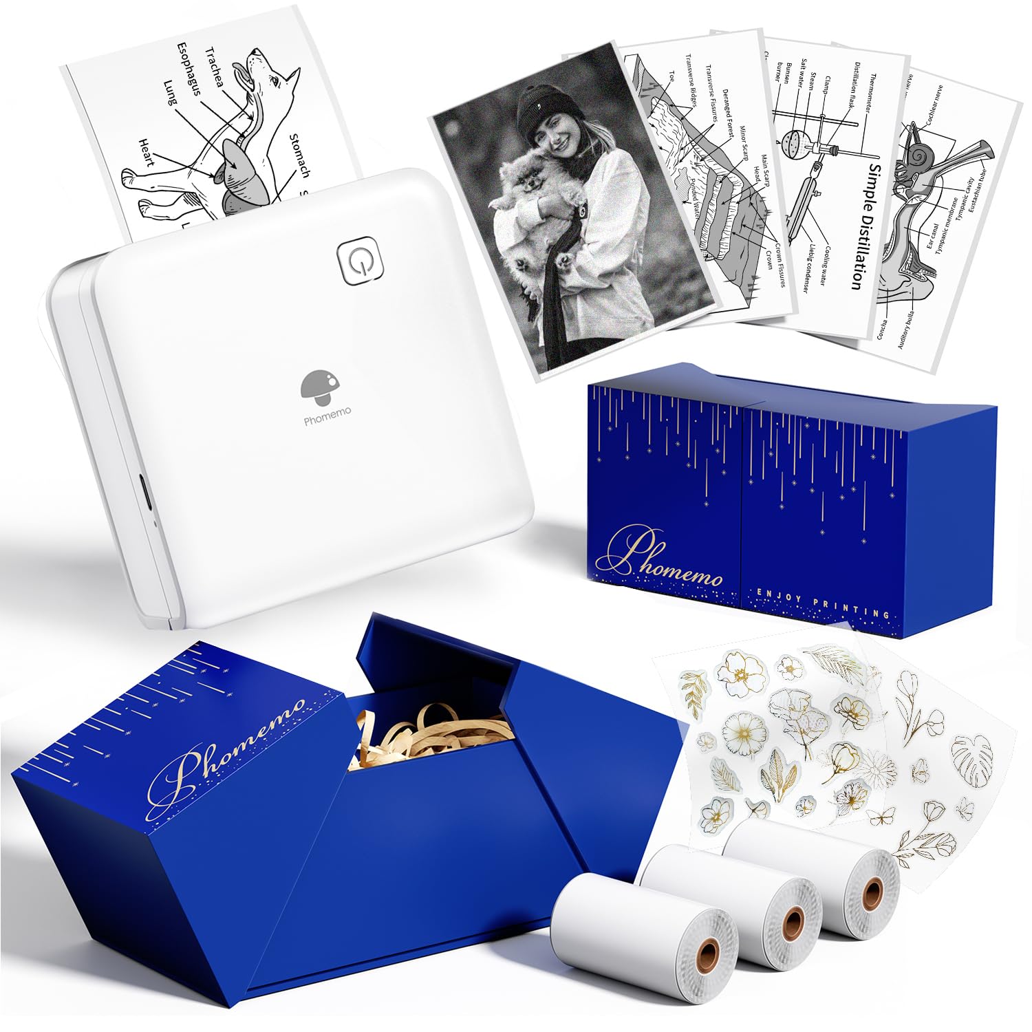 - La confezione include la mini stampante P2S, tre rotoli di carta termica in scala di grigi da 53 mm x 3,5 m, due fogli di adesivi decorativi, un cavo di ricarica Type-C, il manuale d'uso e una confezione regalo.