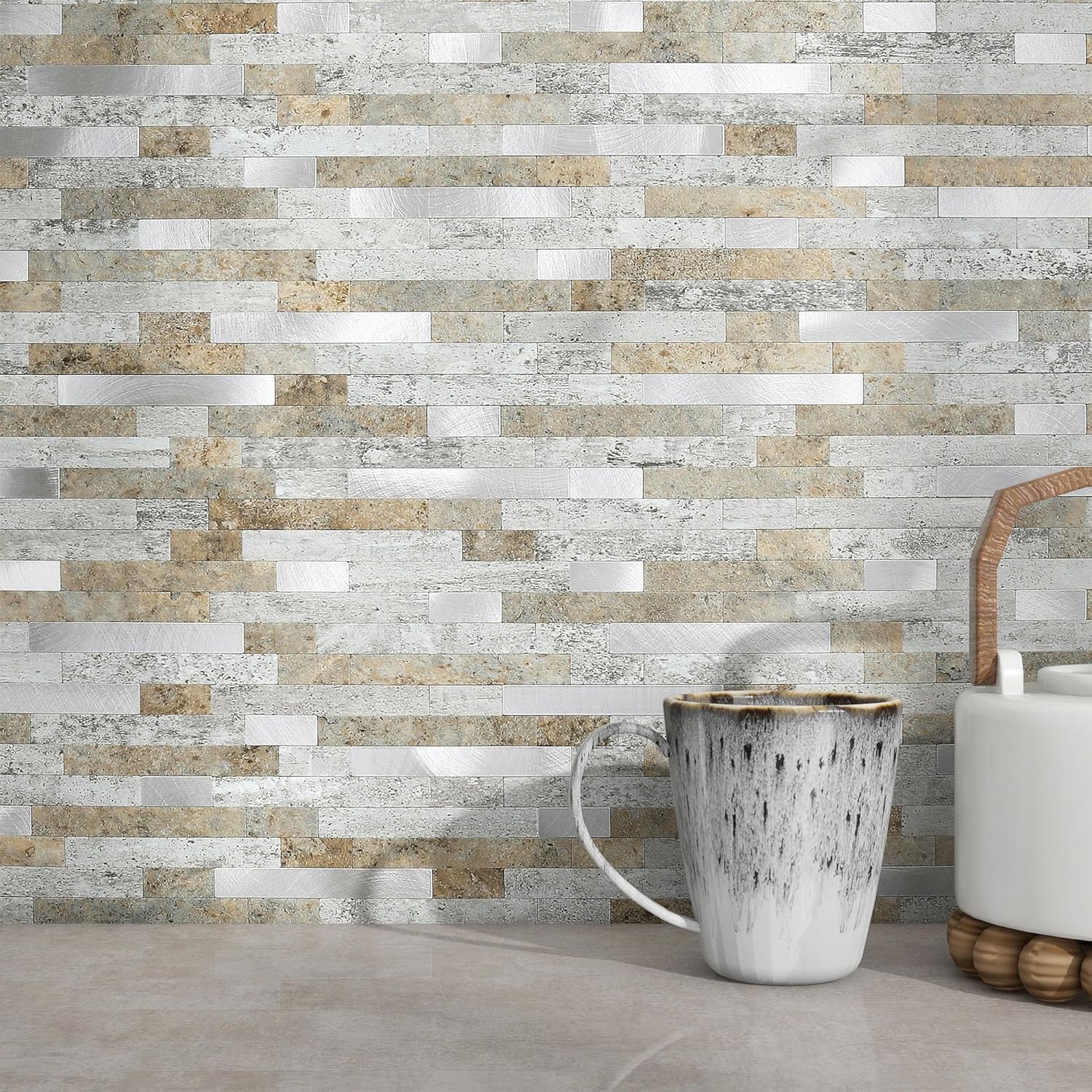 - Backsplash da cucina 3D Peel-and-Stick: questa piastrella da parete a mosaico presenta un effetto pietra opaca e un design lineare metallico lucido. Si tratta di una piastrella senza malta, non ci sono spazi tra i singoli pezzi di mosaico, quindi non è necessaria alcuna malta per completare l'installazione. Totale 90 singoli chip sono montati a mano su un supporto adesivo. Crea pareti fantasiose in un lampo utilizzando piastrelle antiaderenti in pietra opaca e bastone backsplash