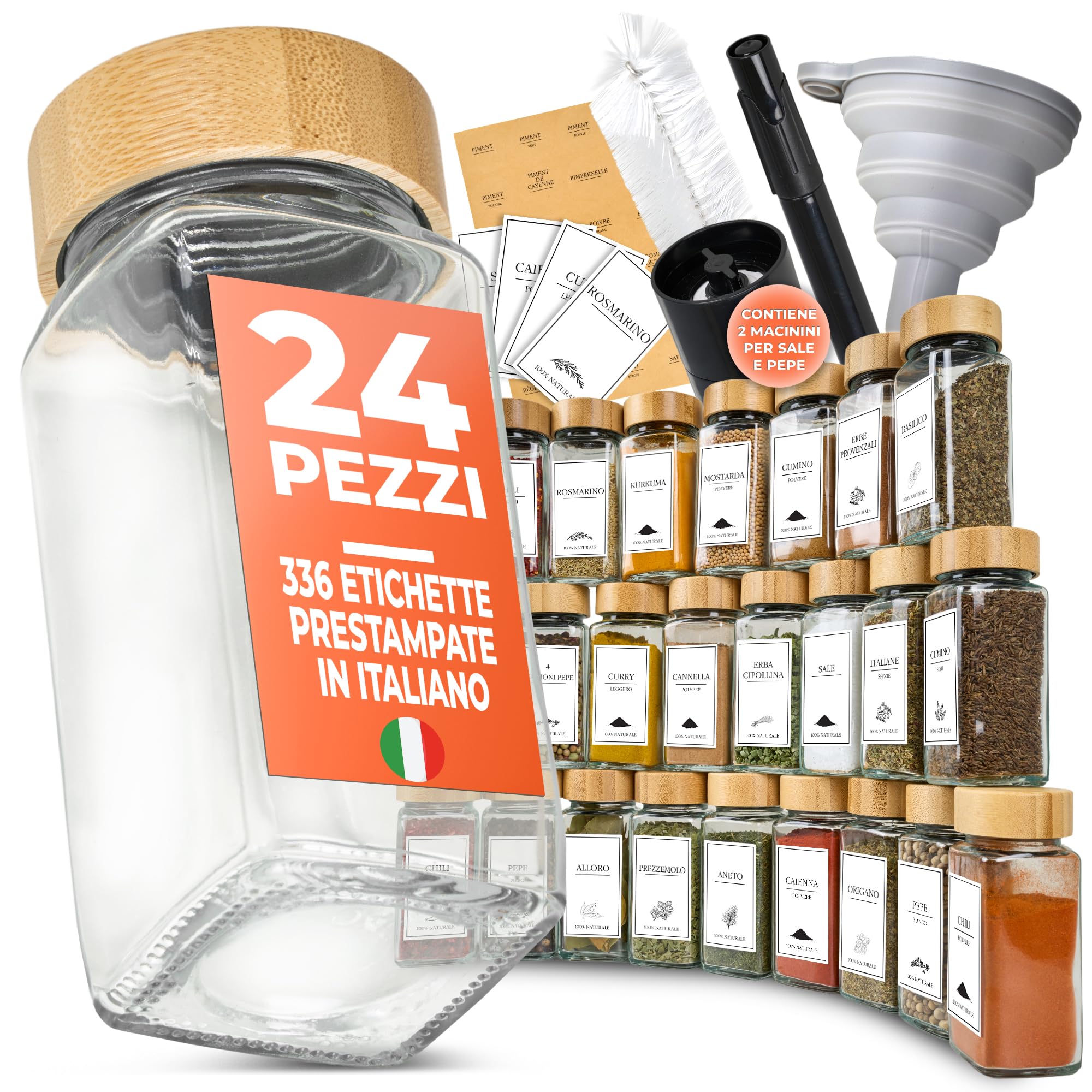 24 contenitori · 336 etichette italiano · 2 mulini · Bambù
