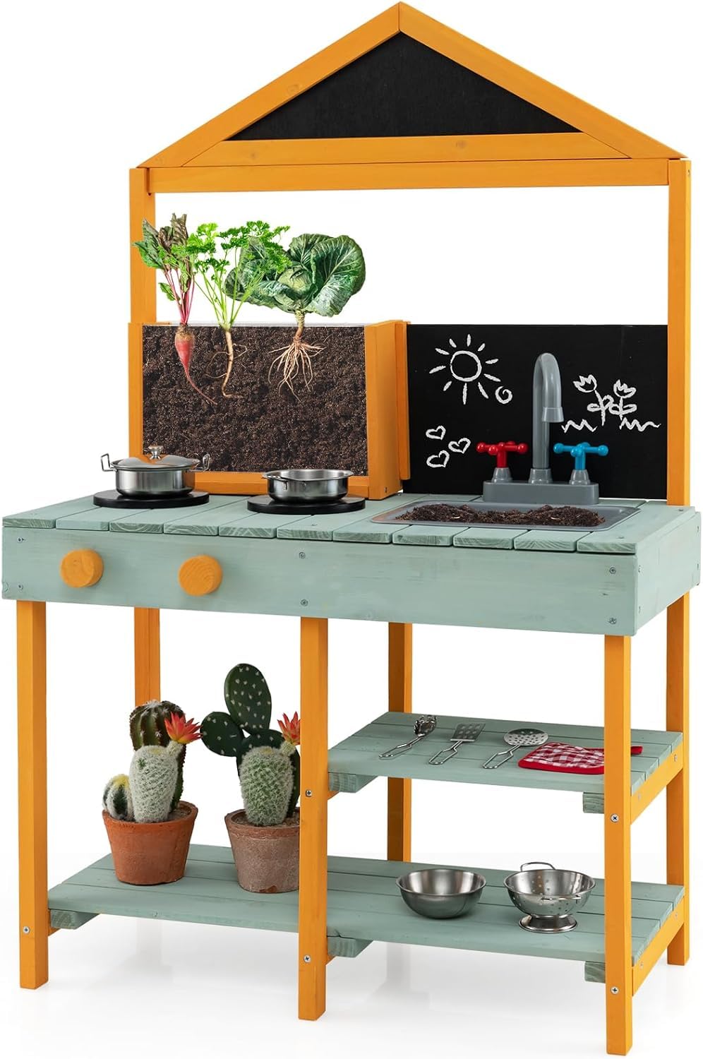 - Robusto telaio in legno di abete: la cucina per fanghi da esterno è realizzata in legno di abete di alta qualità, che la rende stabile e abbastanza resistente da accompagnare i bambini per molti anni.