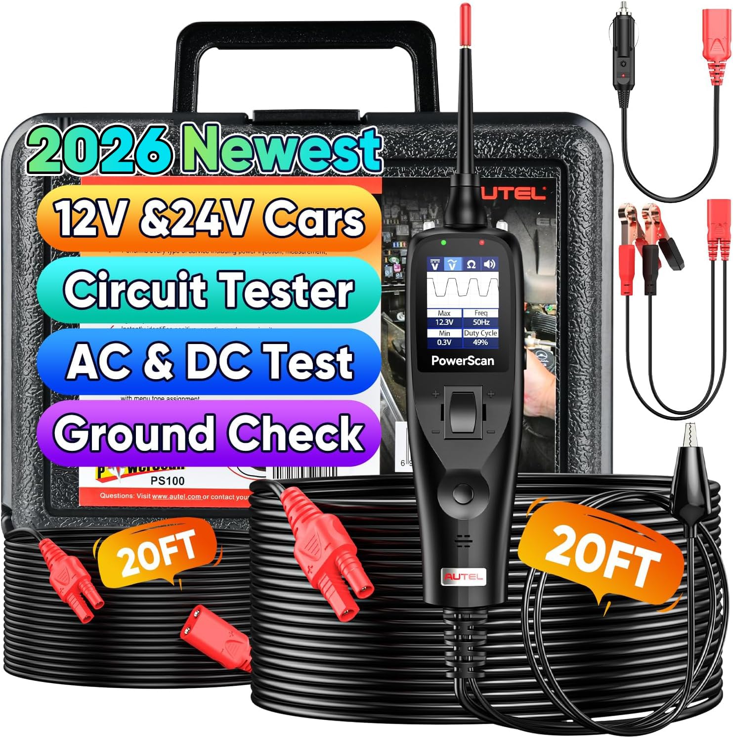 - 📢【Autel PS100 2025 Versione High-Tech Nera, Rivoluzionario】Dite addio ai multimetri, PS100 sovverte regole settore! Autel PS100, Versione High-Tech Nera, KIT Tester per Circuiti di Potenza è pensato per tecnici professionisti, appassionati fai da te e proprietari auto. Come Autel PS100 rosso, questo tester per circuiti auto più preciso è adatto a tutti sistemi elettrici veicoli da 6 a 30 volt. Supporta: ✅Tracciamento e localizzazione cortocircuiti ✅Test Tensione & Polarità ✅Test Continuità ✅Test Circuito Segnale ✅Attivazione Componenti ✅Verifica Messa a Terra Difettosa ✅Protezione Cortocircuito, ecc. 📢Cavo 6 Metri con prolunga 6 Metri, che consente testare veicoli paraurti a paraurti.