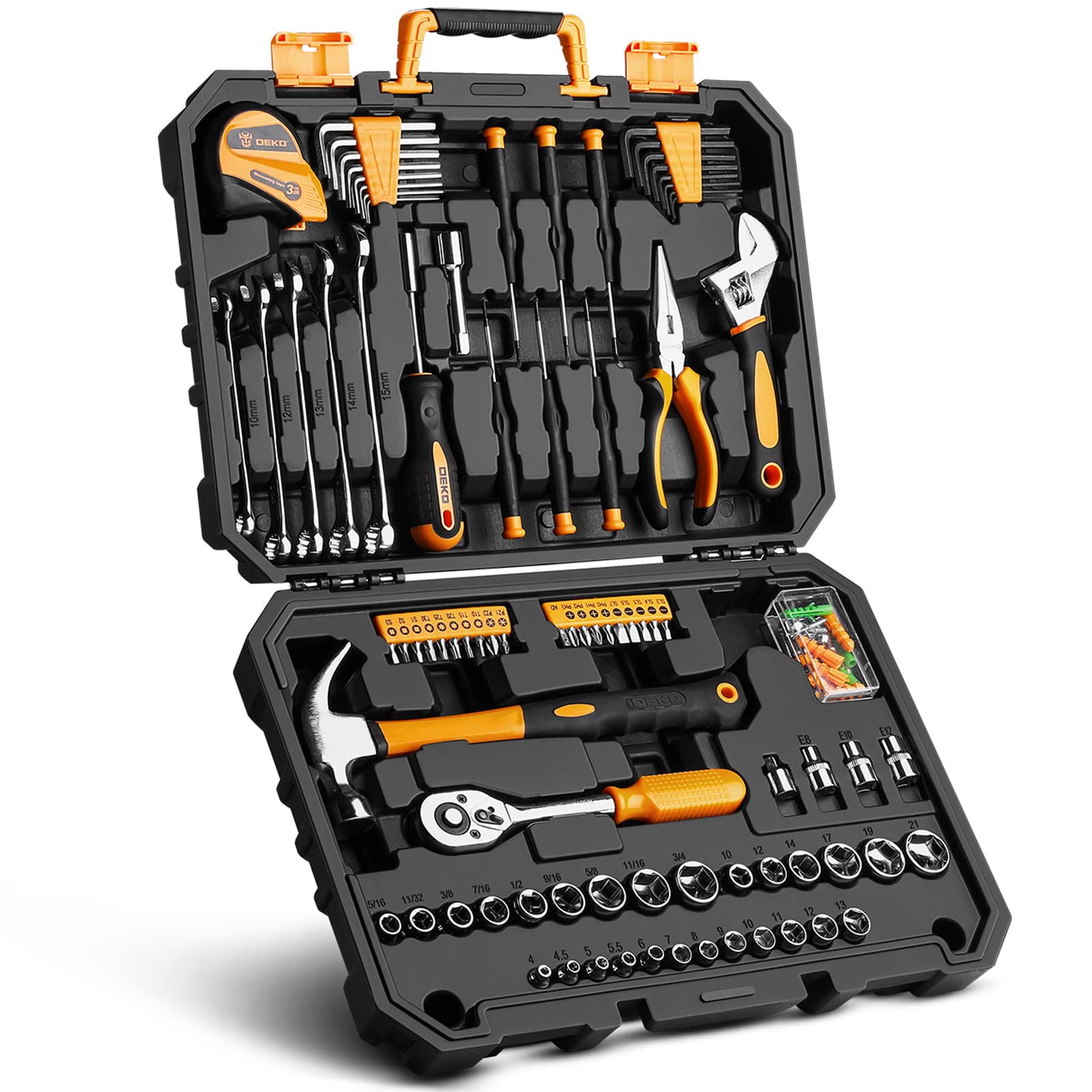 - INCLUDE: assortimento completo di chiavi a cricchetto professionale, cricchetti, una gamma completa di prese e punte per cacciavite e martello di dimensioni metriche, martello, metro a nastro, pinze, include anche set da 1/4 "e da 3/8", per garantire dimensioni precise. E il cricchetto da 72 denti si sposterà facilmente per cambiare direzione azionando un interruttore a 5 gradi. Varietà di punte per cacciaviti da 1/4 di pollice: Phillips, a fessura, a squadra, a stella e pozi