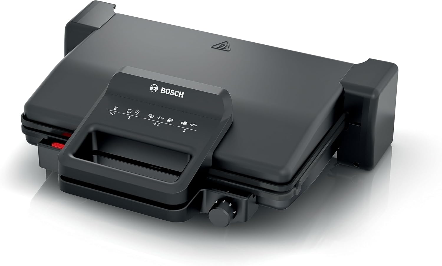 - Offre molteplici modalità di cottura grazie alle sue tre posizioni: può essere utilizzata chiusa come grill a contatto, aperta come barbecue da tavolo, oppure chiusa con riscaldamento superiore e inferiore per gratinare o riscaldare.