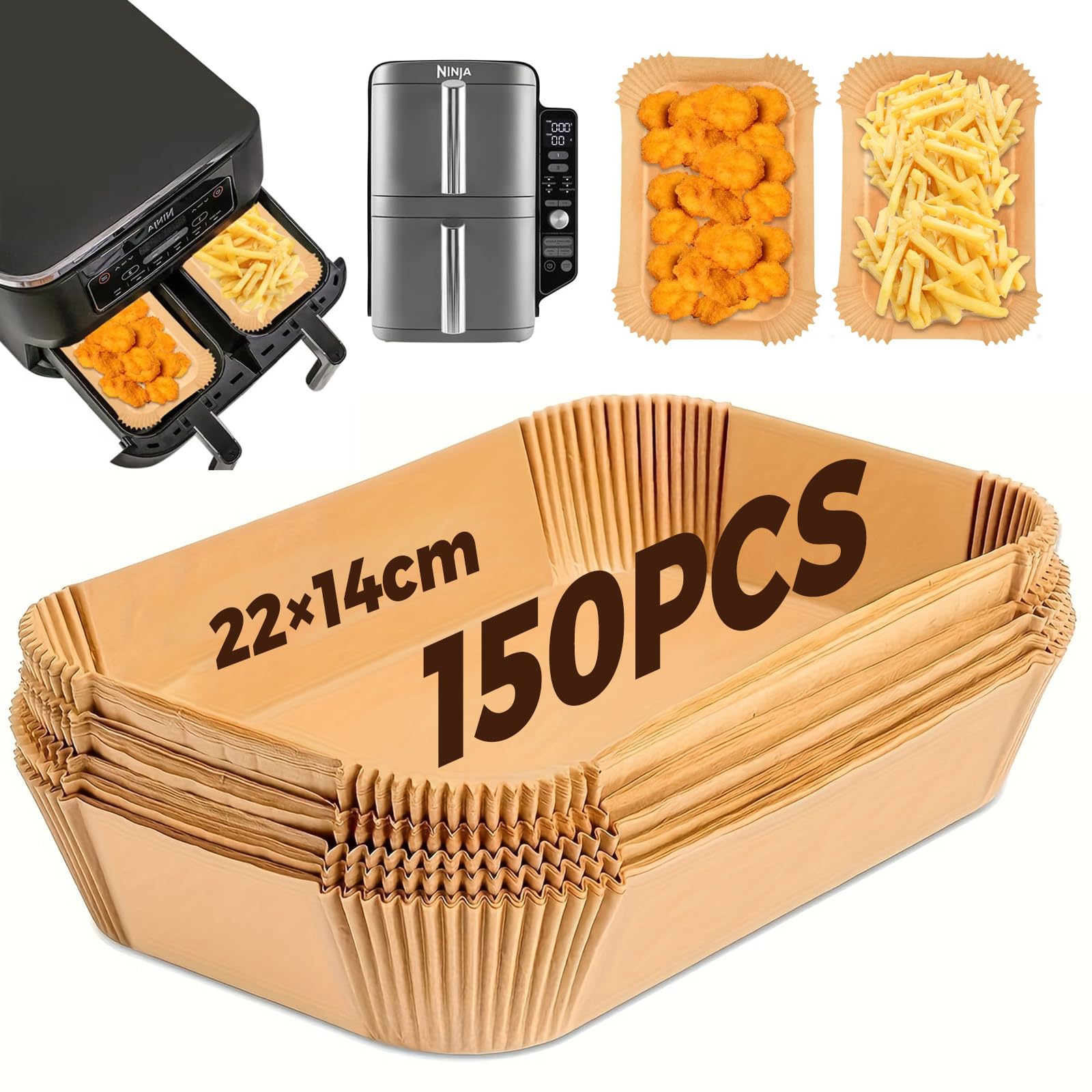 - La confezione include 150 fogli rettangolari di carta pergamena antiaderente, con dimensioni interne di 22×14 cm e un bordo rialzato di 3,5 cm per proteggere i lati della friggitrice, compatibili con modelli come Ninja Foodi Dual Zone Double Stack e altre friggitrici ad aria doppie.