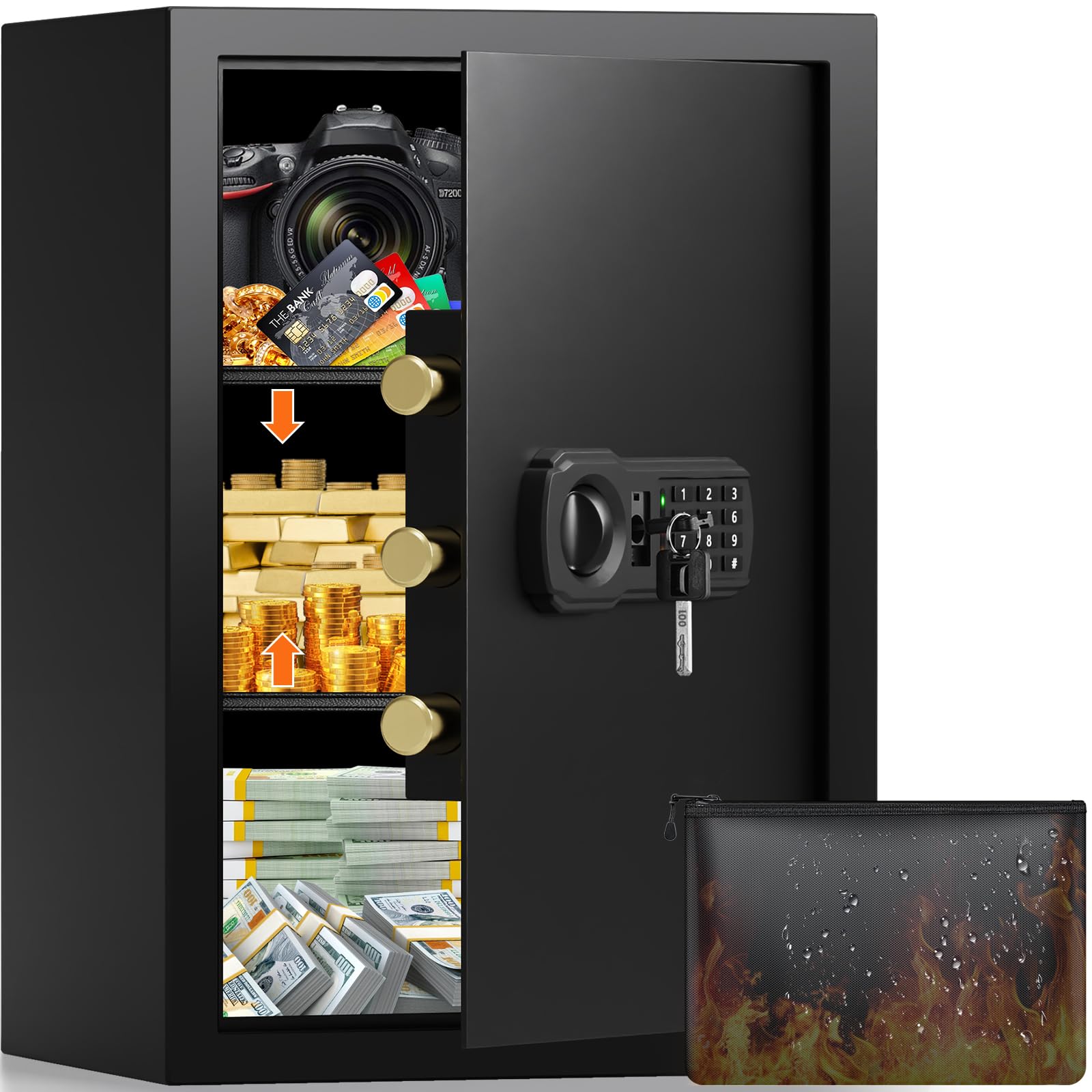 - Grande cassaforte ignifuga con tasca portadocumenti A4: dimensioni esterne (L x P x A): 38 x 31 x 55 cm. La cassaforte per la casa viene fornita con un set di documenti A4 ignifugo che protegge anche i tuoi oggetti di valore da incendi, uragani e terremoti. Gli scaffali rimovibili consentono anche di organizzare facilmente i tuoi oggetti importanti. L'opzione migliore per proteggere i tuoi oggetti di valore da bambini o visitatori curiosi