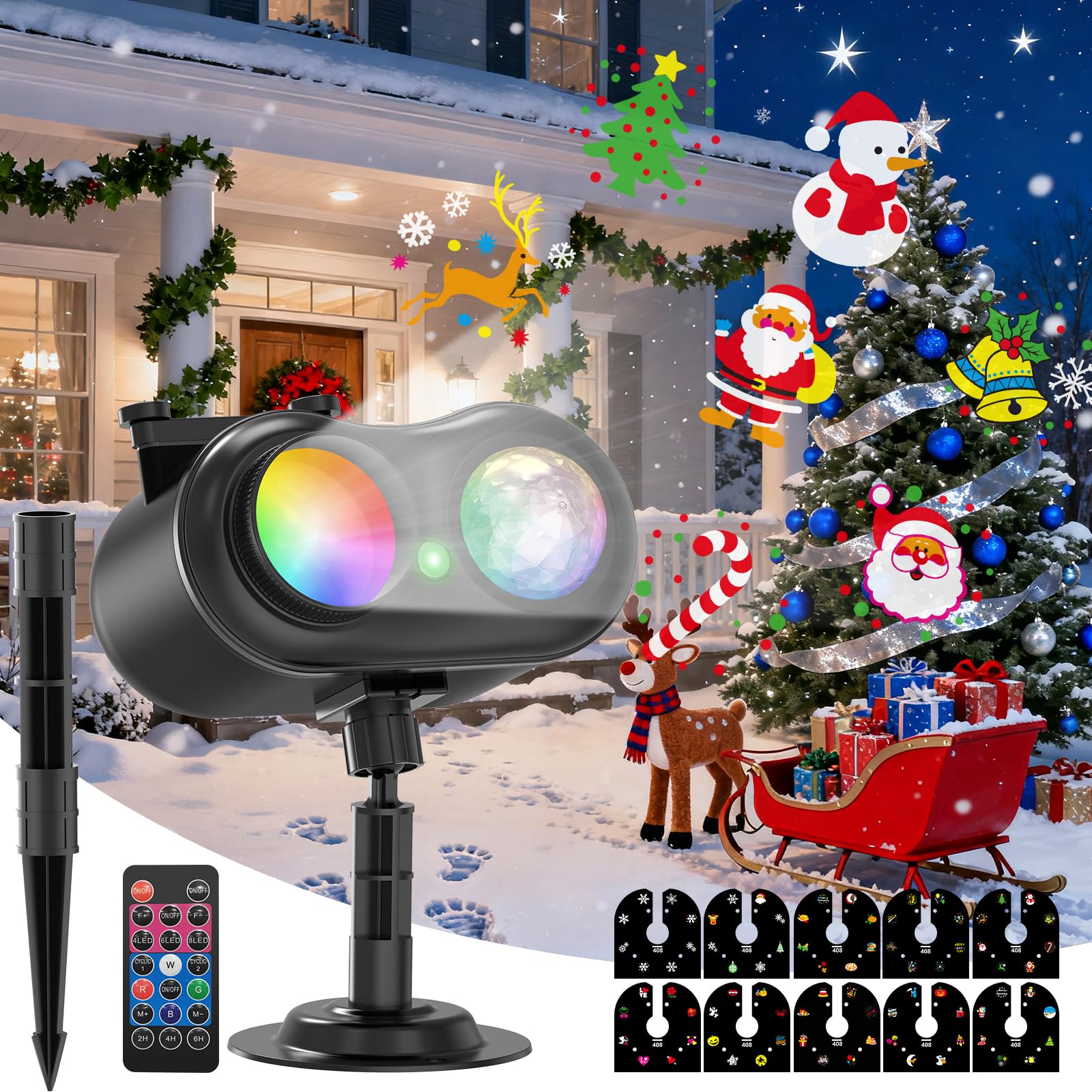 - 🎄【Atmosfera Magica con Doppia Proiezione Dinamica】 Goditi la neve più realistica con il nostro proiettore di Natale a doppia testa regolabile fino a 270°! Grazie a 10 diapositive incluse (80 motivi tra fiocchi di neve, Babbo Natale, renne e angeli) e luci LED 9W ad alta luminosità, crei in un attimo un effetto nevicata incantato su pareti, soffitti o giardini. Perfetto per decorare interni ed esterni con un bagliore vibrante e nitido.