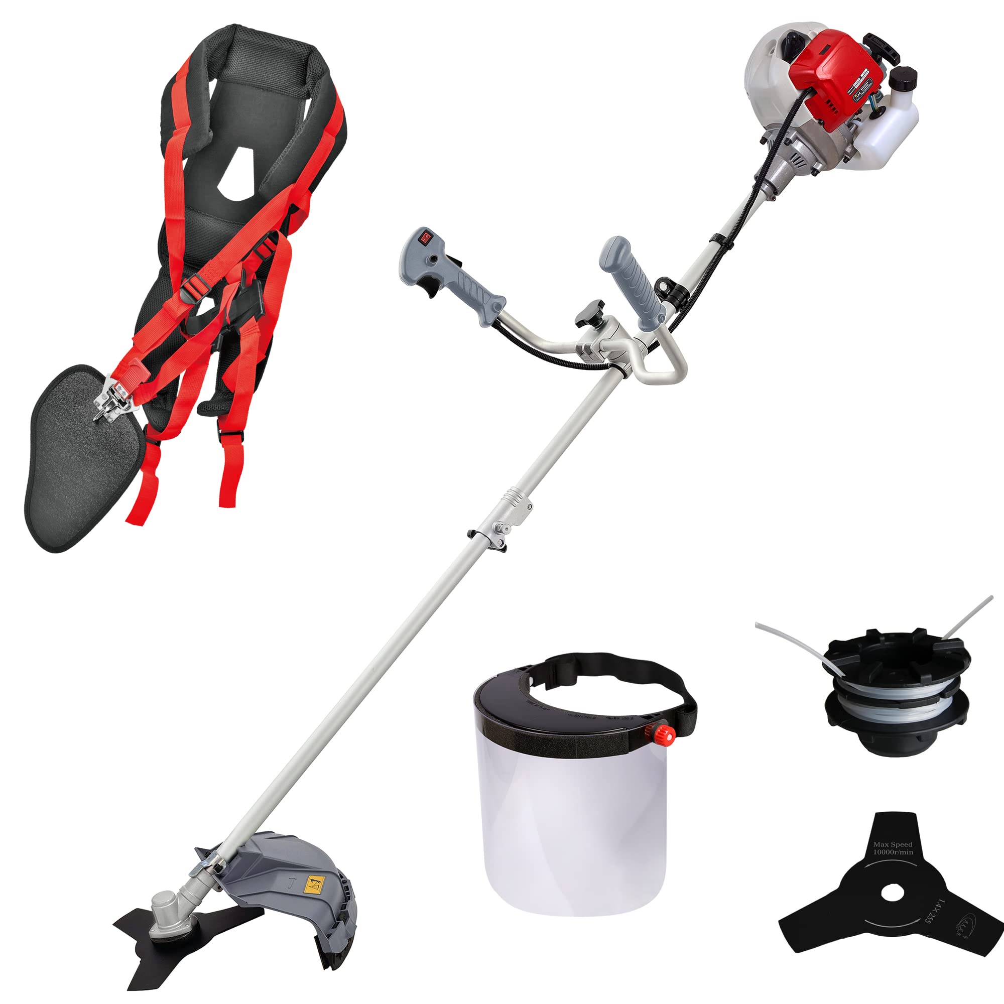 Include bobina filo, lama 3 denti, tracolla professionale, scudo protezione
