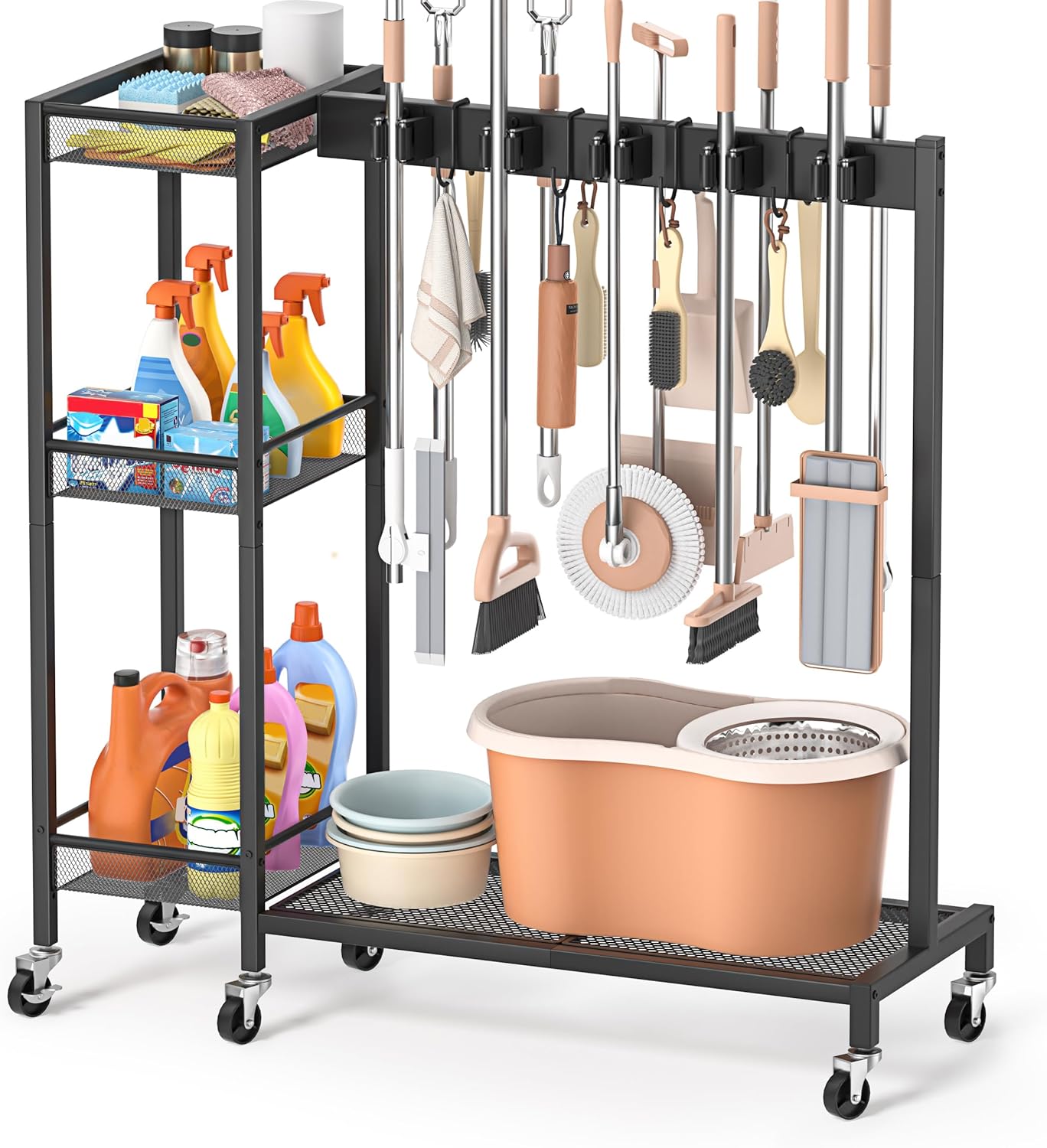 - Porta Scope e Mop 2 in 1 con Carrello Organizer: Questo pratico sistema unisce un porta scope e mop con un carrello portaoggetti per prodotti di pulizia. Tieni spazzole, mop, scope e detergenti ordinati in un’unica stazione compatta — perfetta per lavanderie, cucine o ripostigli.