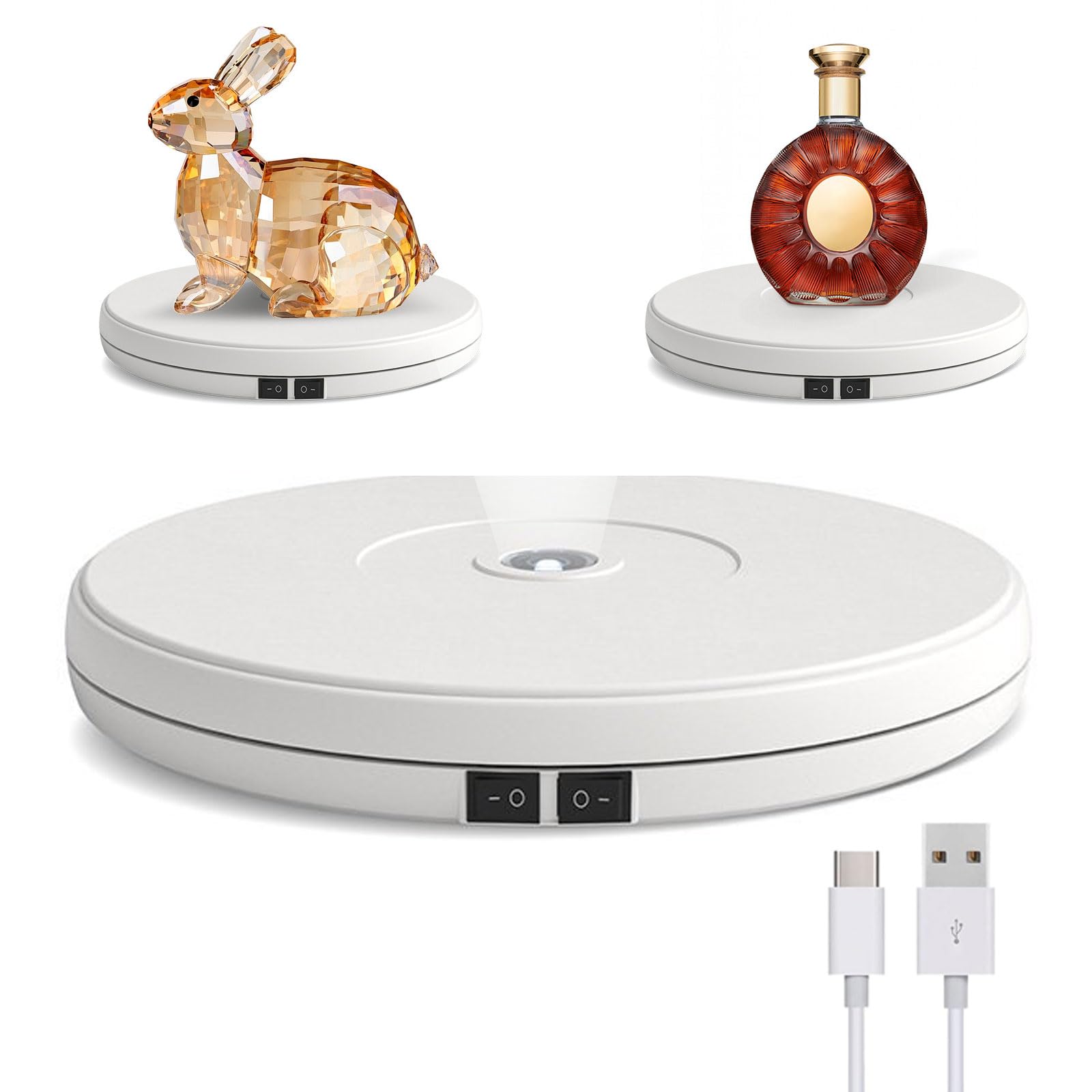 - Piatto girevole a LED motorizzato – Supporto rotante motorizzato di alta qualità con luce LED luminosa. Gli angoli di rotazione sono regolabili, in modo da poter presentare perfettamente i tuoi prodotti da tutte le direzioni e creare un'atmosfera suggestiva.