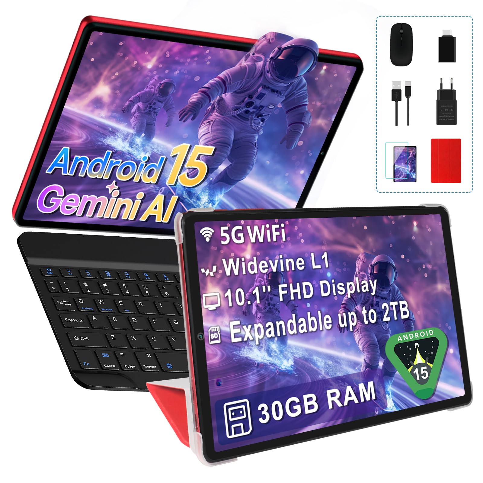 30GB RAM · 64GB ROM espandibile 2TB · Octa-Core · Widevine L1 · WiFi 5G BT5.0 · Include Tastiera, Mouse e Custodia