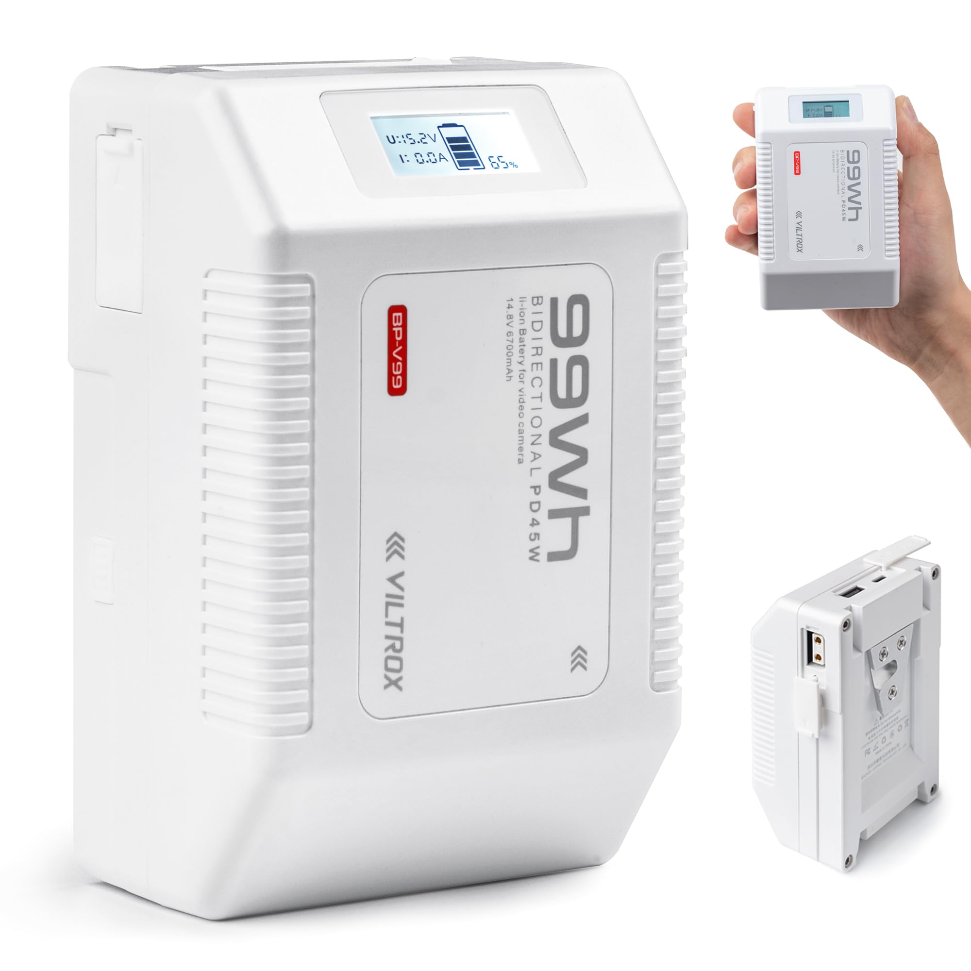 - La batteria VILTROX BP-V99 V-Mount/V-Lock offre una notevole capacità di 6700 mAh (99Wh/14,8 V), fornendo energia sufficiente per sessioni prolungate di riprese cinematografiche, video e fotografiche, ideale come fonte di alimentazione di riserva o da viaggio per professionisti.