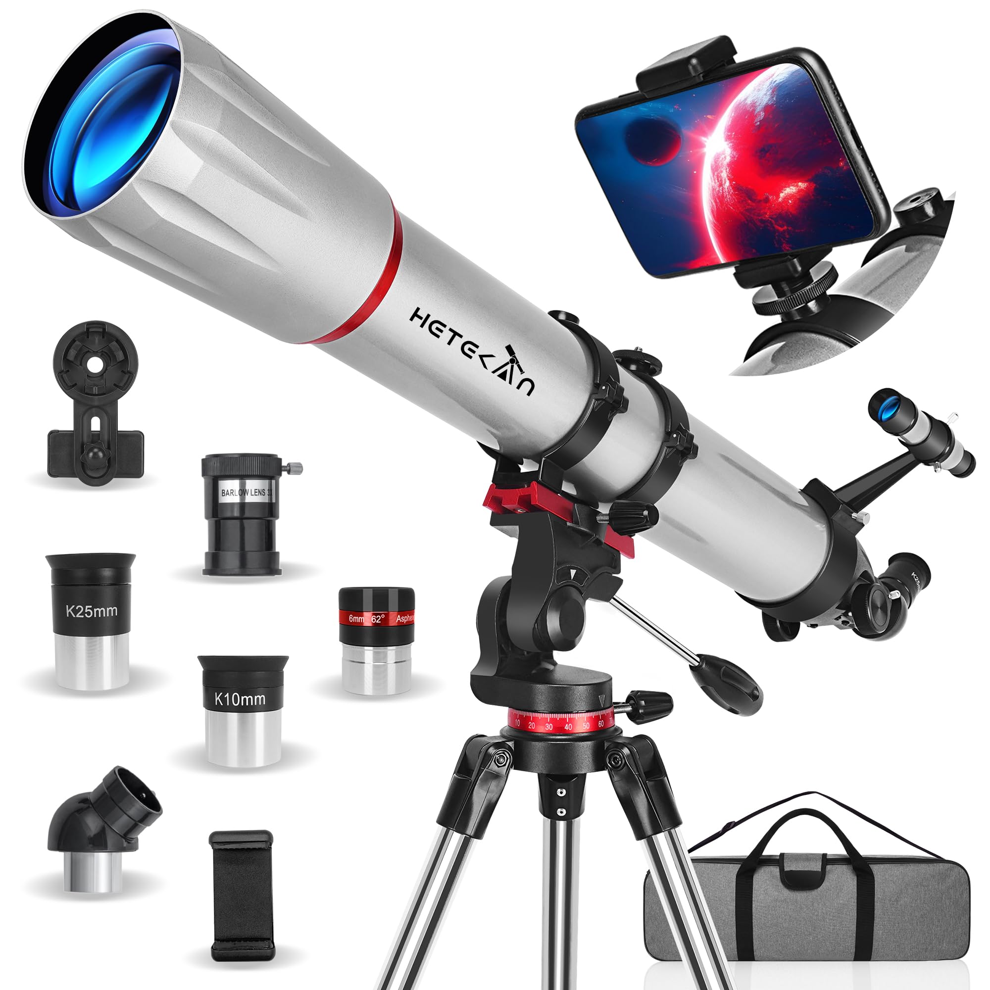- Accessori e Supporto: Il telescopio astronomico HETEKAN include uno specchio zenitale, oculari da 25 mm, 10 mm e 6 mm, una lente Barlow 3x, un cercatore, un treppiede con montaggio AZ, una borsa da trasporto, un vassoio per accessori e un supporto per smartphone per l'osservazione delle stelle. Il nostro team tecnico è sempre disponibile per fornirti supporto.