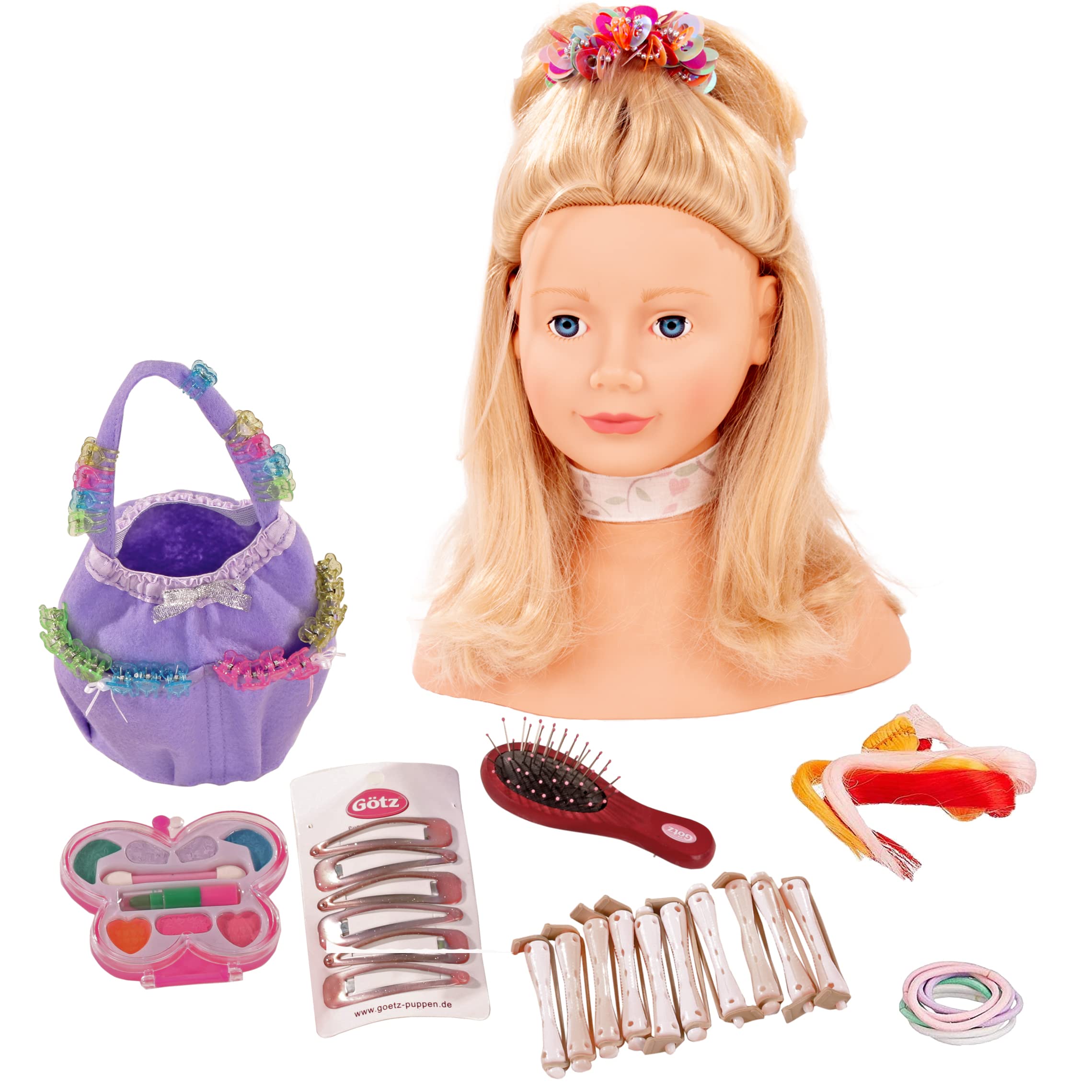 - La confezione comprende una testina per parrucchiere con capelli biondi (28 x 25 cm) e un set completo di 57 accessori Götz.