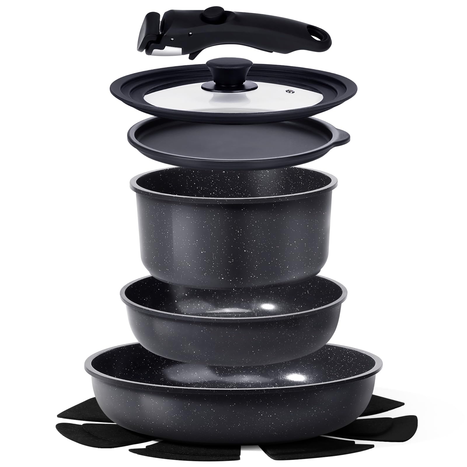 - Set completo e compatto per piccole famiglie: include padelle da 24 cm e 30 cm, bollilatte da 22 cm, coperchio universale in vetro (22-26 cm), coperchio di stoccaggio, 2 protezioni per pentole e 1 manico rimovibile, tutti impilabili per risparmiare spazio.