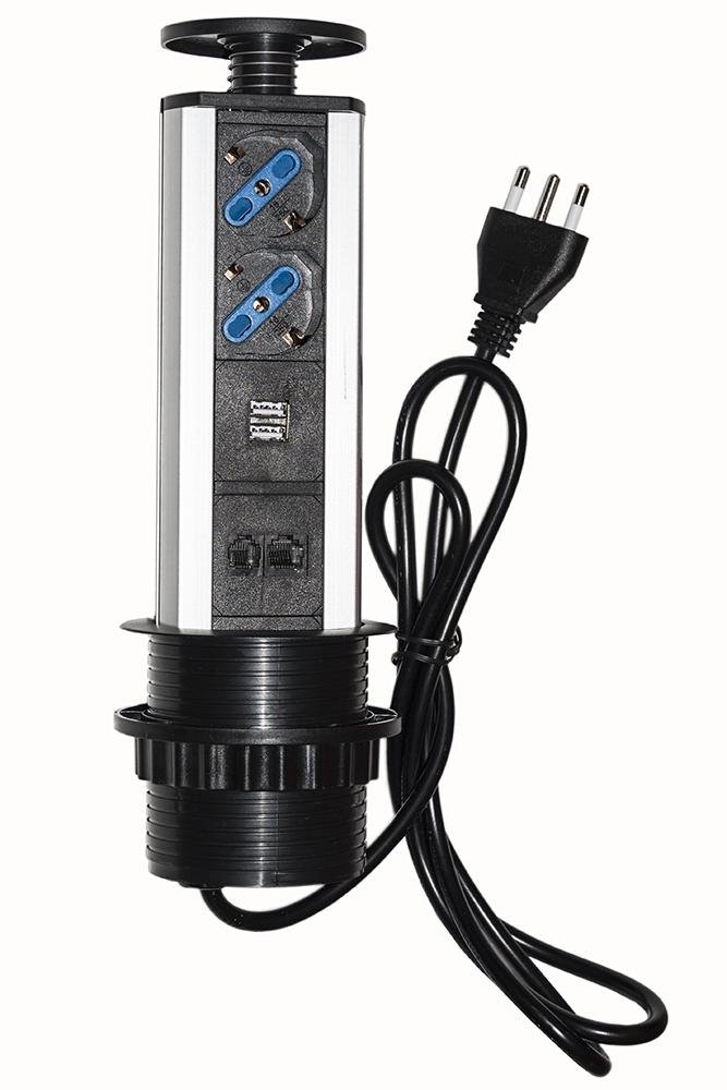 - Multipresa a scomparsa progettata per l'installazione su tavoli o ripiani, ideale per ottimizzare lo spazio e mantenere l'ordine.