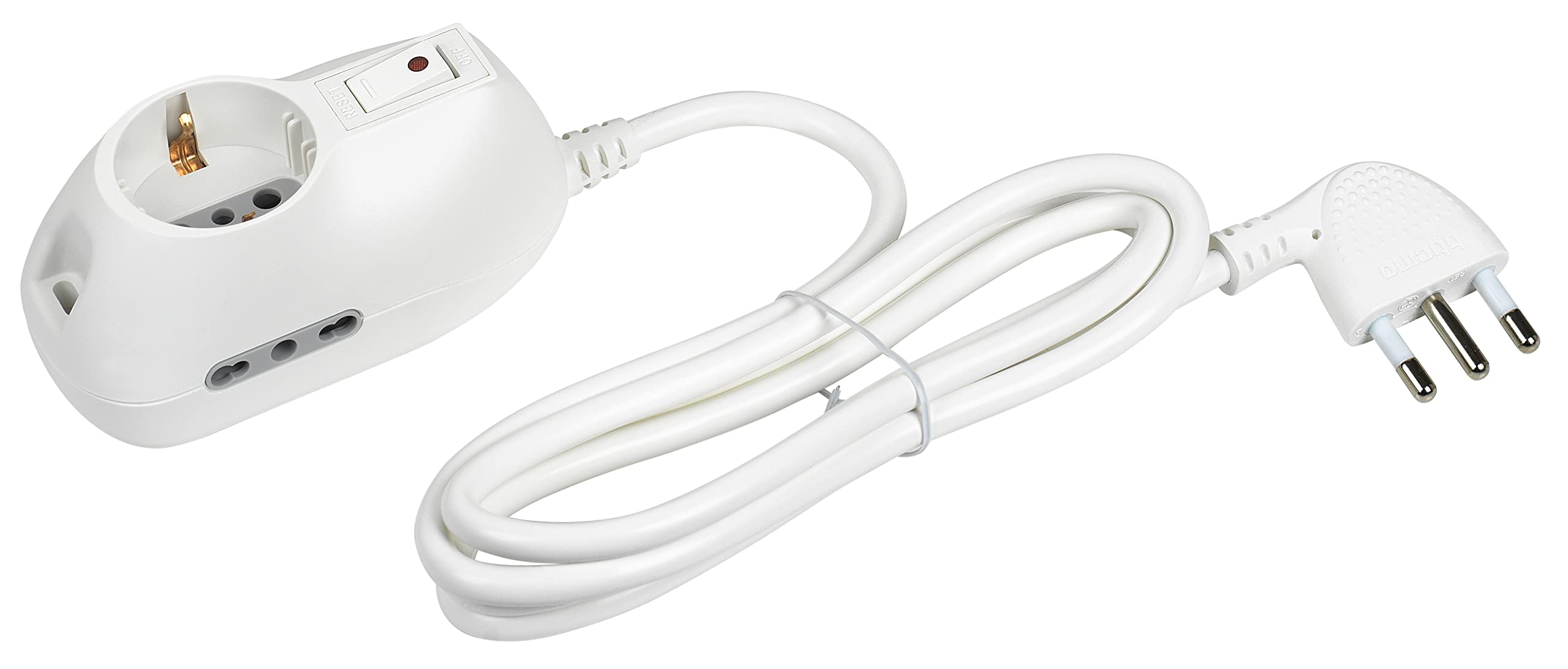 1 Schuko 10/16A + 2 Bivalenti 10/16A · Cavo 1,5m · Salvaspazio