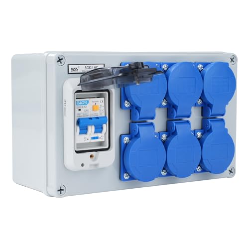 - Questo distributore da cantiere da 16 A include un interruttore 1P+N da 63 A con protezione differenziale trasparente IP67 e sei prese Schuko 16 A 250 V con cavo di messa a terra per la sicurezza del circuito.
