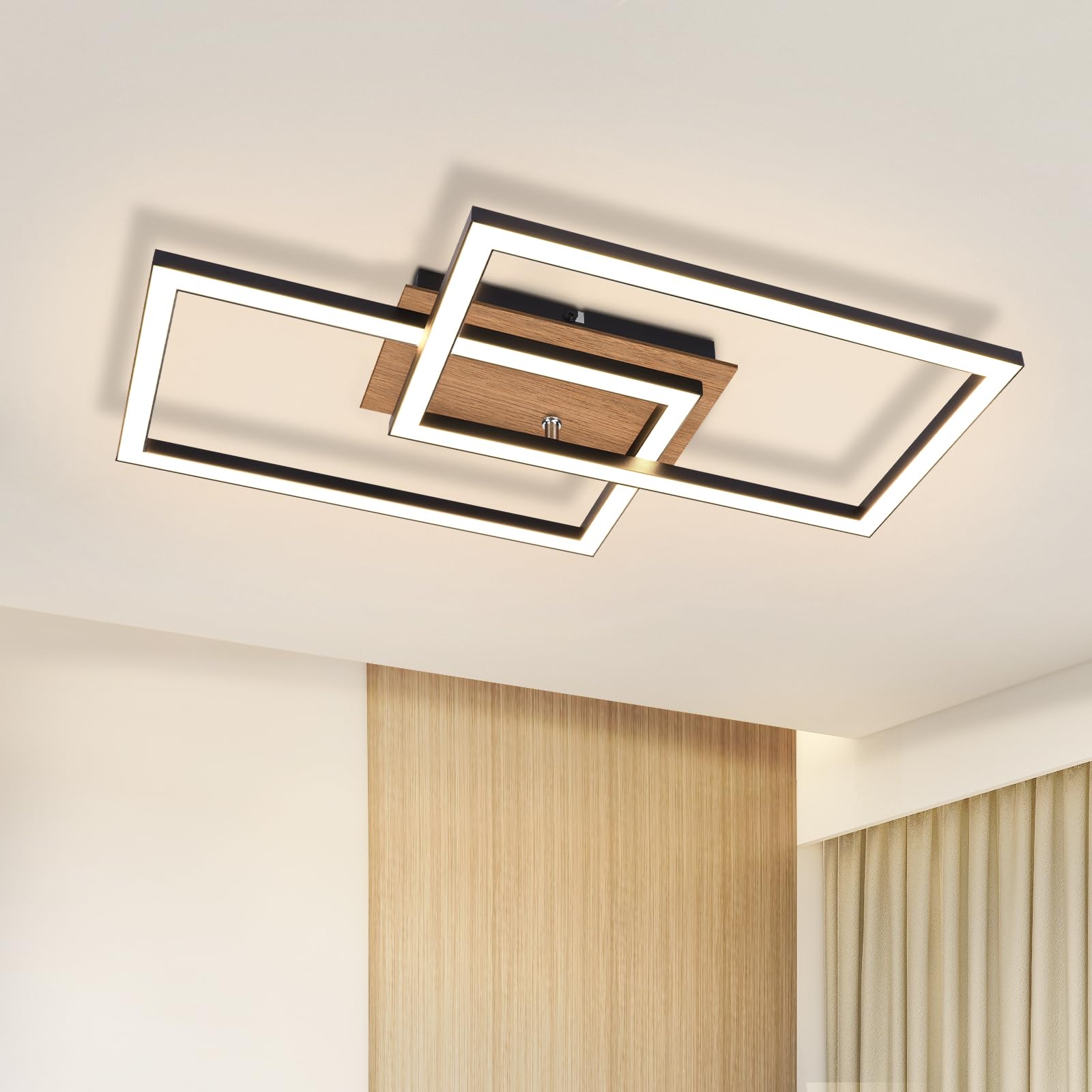 - Realizzata con materiali di alta qualità come alluminio, ferro, plastica e legno MDF, questa plafoniera LED assicura una struttura robusta e duratura nel tempo.