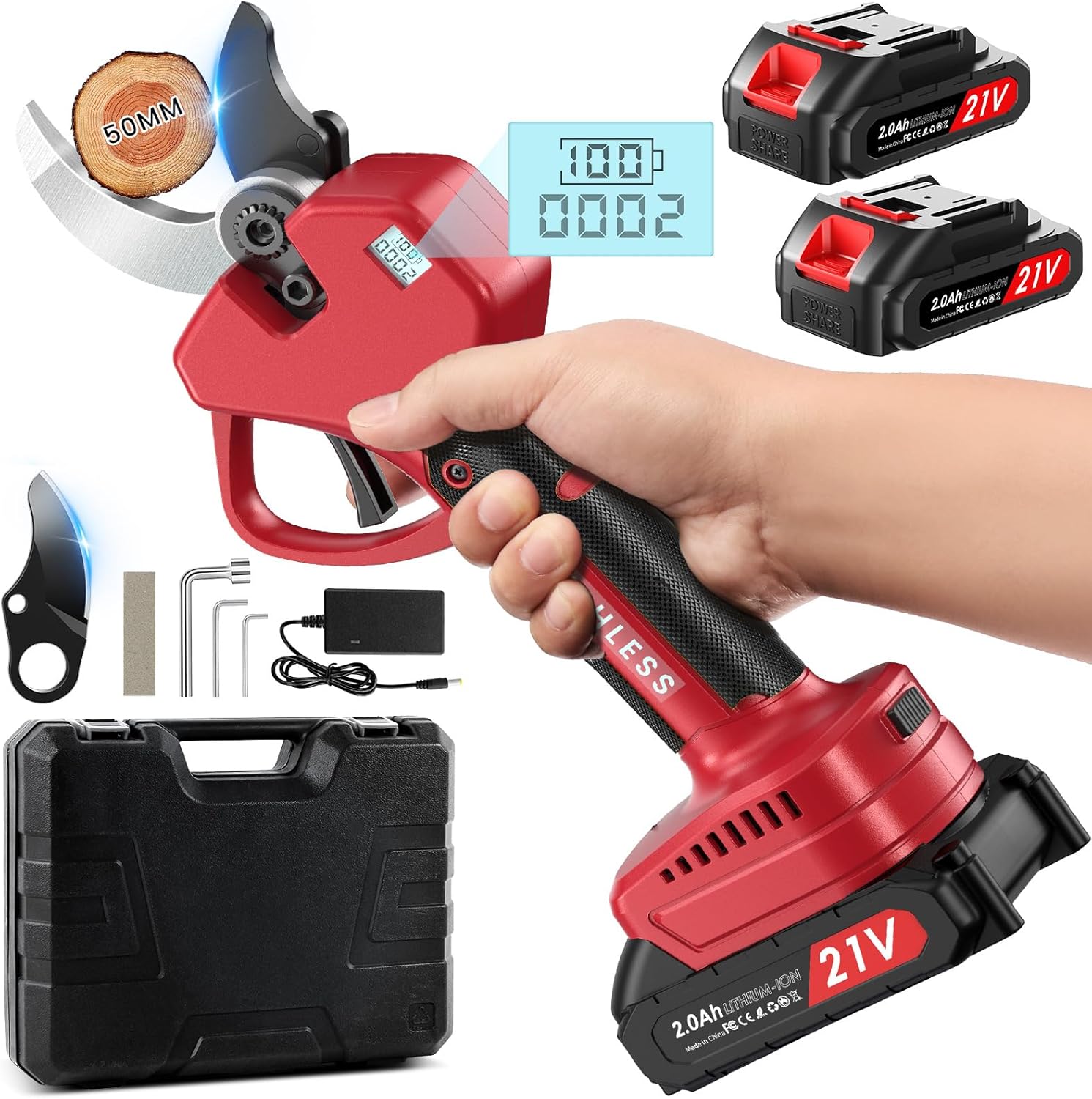 - Le forbici da potatura a batteria sono dotate di una lama in acciaio al carbonio svizzero SK7 e un motore brushless da 800W, garantendo tagli precisi e potenti su rami fino a 50 mm di diametro. Il design a lama curva favorisce tagli netti senza danneggiare la vegetazione.