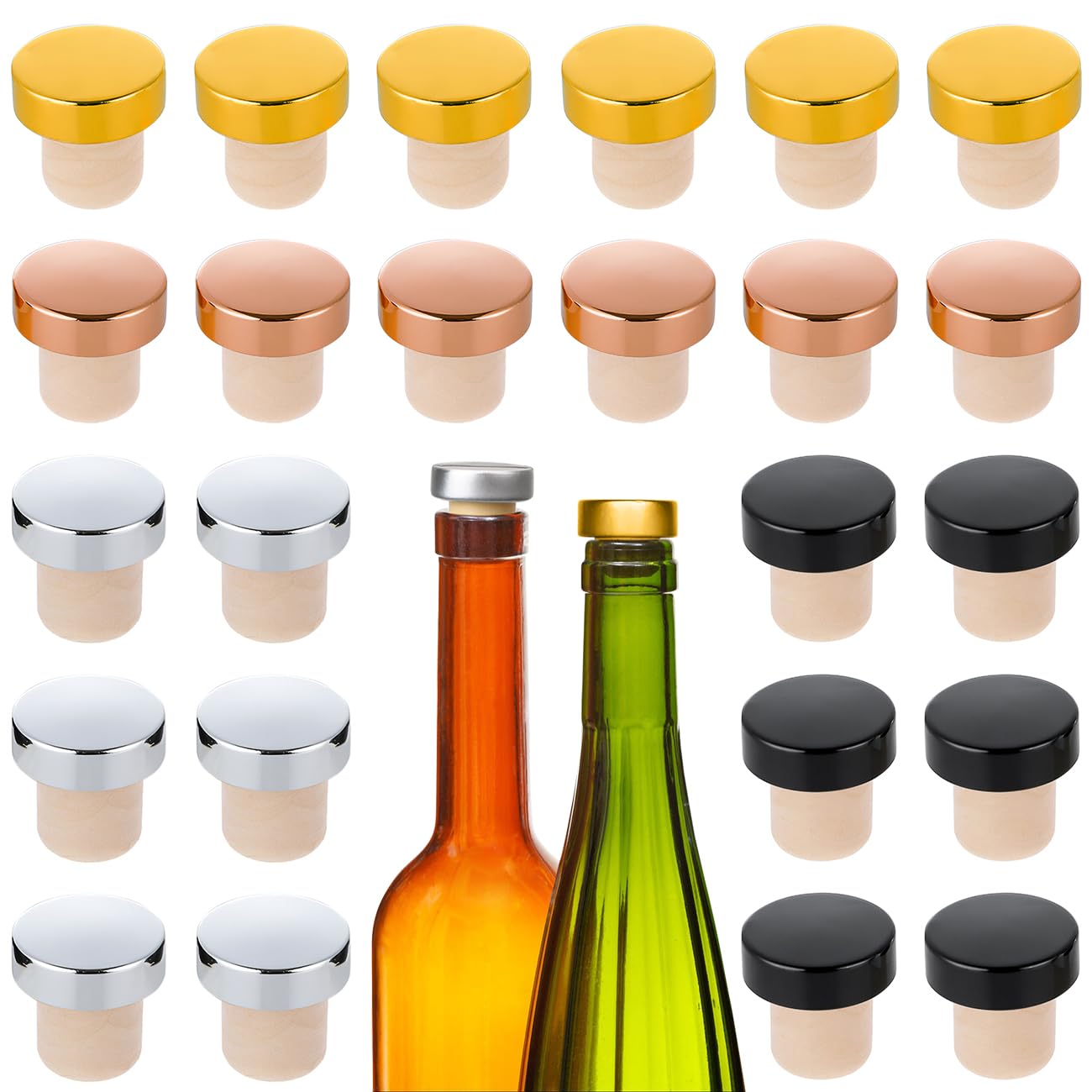 - Il set include 24 tappi per bottiglie di vino in quattro colori: oro, argento, nero e oro rosa. Questi tappi sono adatti per bottiglie da 375 ml, 500 ml e 750 ml, con un diametro del tappo compreso tra 1,85 cm e 1,95 cm. Si consiglia di verificare che il diametro interno della bottiglia sia circa 0,5 mm inferiore al diametro del tappo.