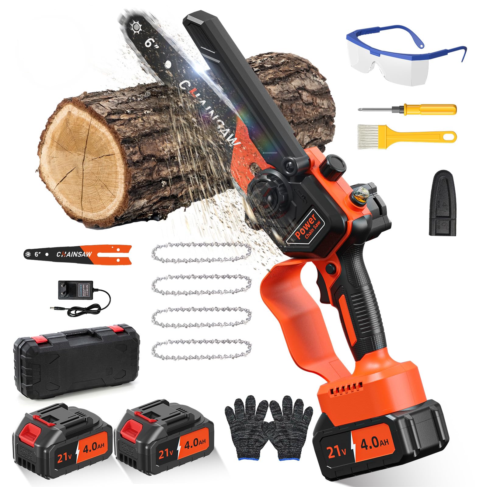 - Kit multi accessori: Gli accessori della mini sega elettrica a batteria includono una guida da 6 Pollici, 2 batterie da 4000mAh, 4 catene da 6 Pollici, caricabatterie, cacciavite, spazzola per la pulizia, guanti antiscivolo, occhiali di sicurezza, protezione per la catena e istruzioni dettagliate.
