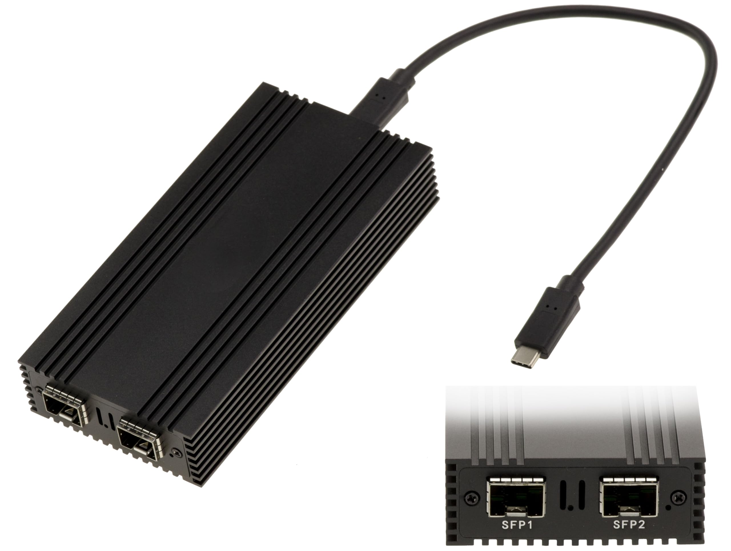 - Per trasferire dati utilizzando una rete in fibra SFP+ tramite un adattatore di tipo Thunderbolt 3. Molto utile per PC privi di scheda di rete o con connessione di rete danneggiata, oppure per creare un ponte di rete. Questo adattatore dispone di due porte SFP+ indipendenti.
