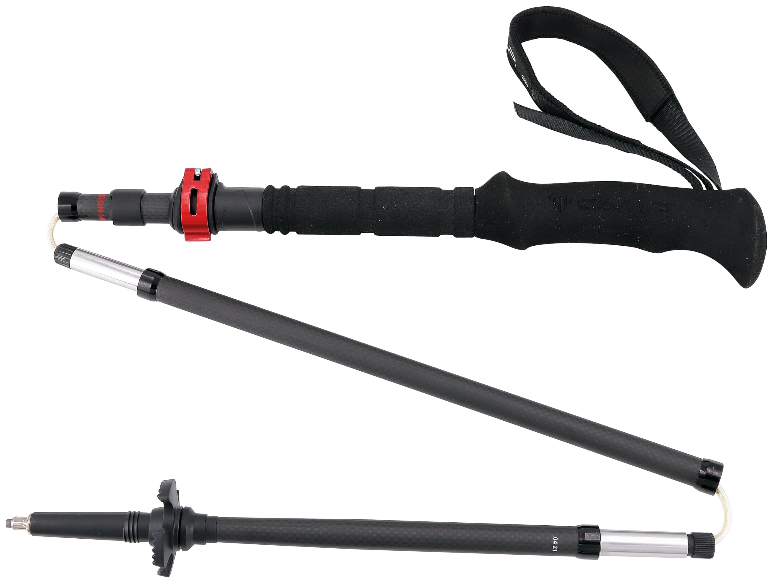 - Bastoncino pieghevole realizzato con una combinazione di fibra di carbonio e alluminio, garantendo leggerezza e robustezza.