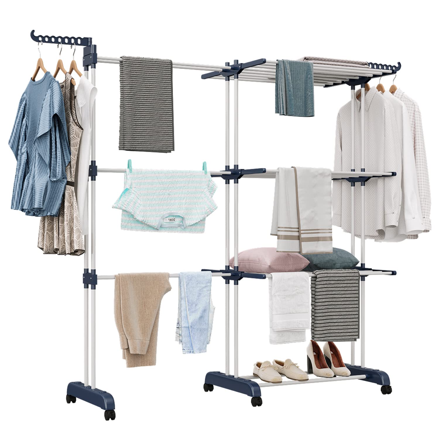 - Design estensibile 2 in 1, la larghezza può essere selezionata liberamente tra 66 cm e 130 cm. Utilizzate la superficie sinistra dei livelli di asciugatura per asciugare capi più grandi come la biancheria da letto.