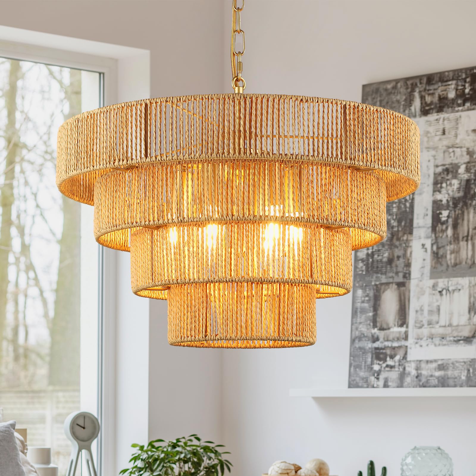 - Questo lampadario in rattan intrecciato è realizzato con cura, combinando rattan e quattro cornici metalliche rotonde di alta qualità per formare una gabbia semicircolare vuota, che conferisce uno stile Boho naturalmente elegante e misterioso.