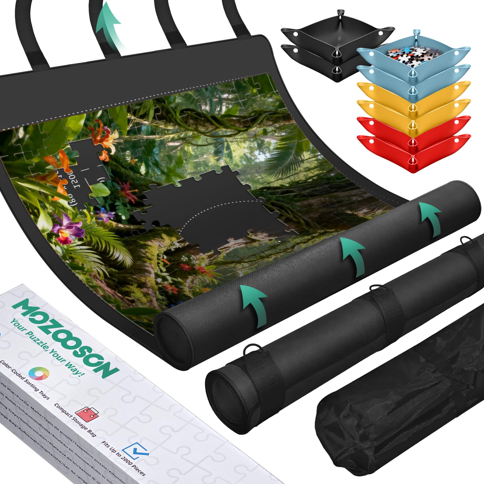 - Cosa Contiene la Confezione — Il tuo set completo include: 1x tappetino per puzzle in gomma (adatto fino a 3000 pezzi), 1x rullo in schiuma, 8x vassoi separatori, 5x cinturini di fissaggio, 1x sacchetto antipolvere per tenere tutto in perfetto ordine.